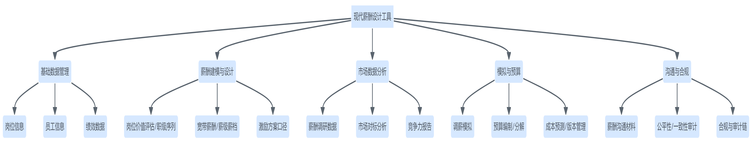 同时,为了让“工具能力”更直观,我们把现代薪酬设计工具的核心模块拆开(不同产品覆盖深浅不同):