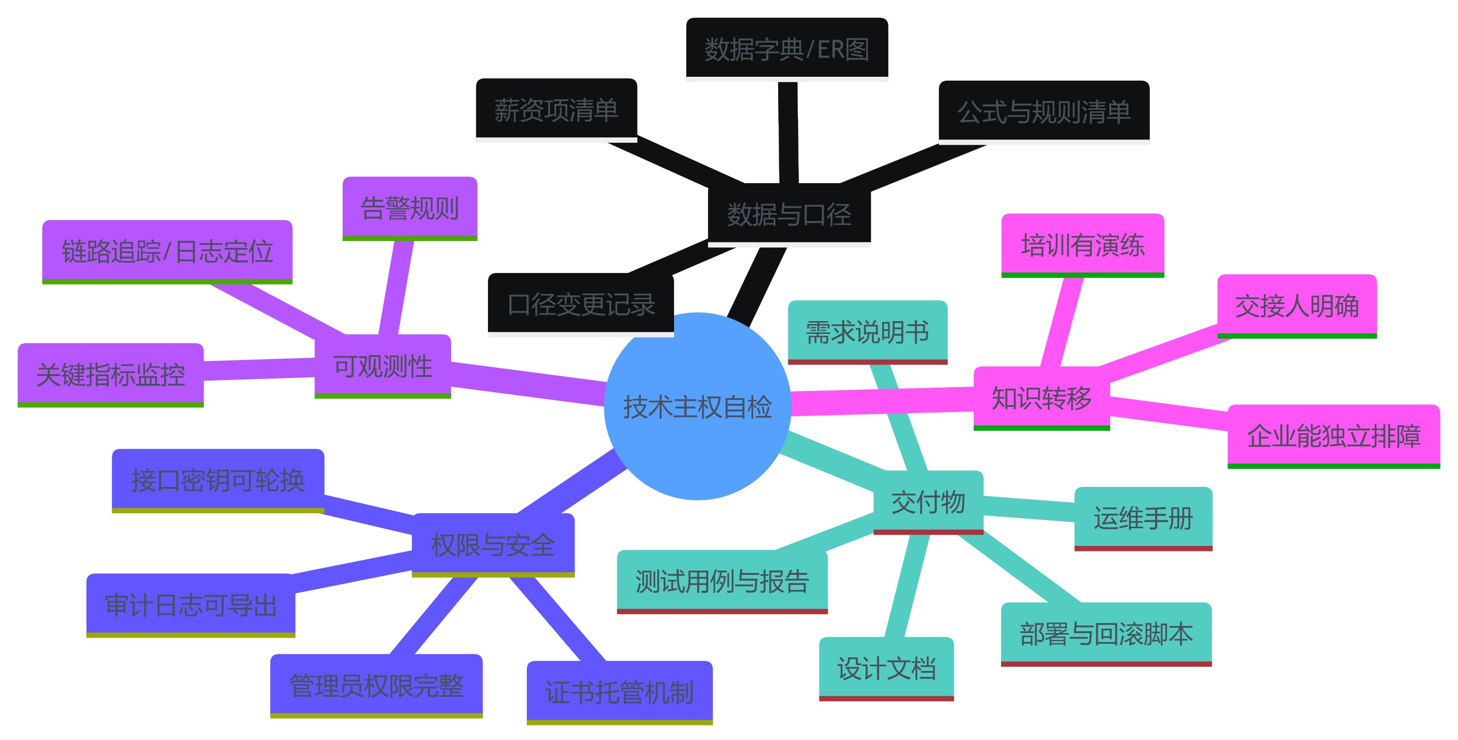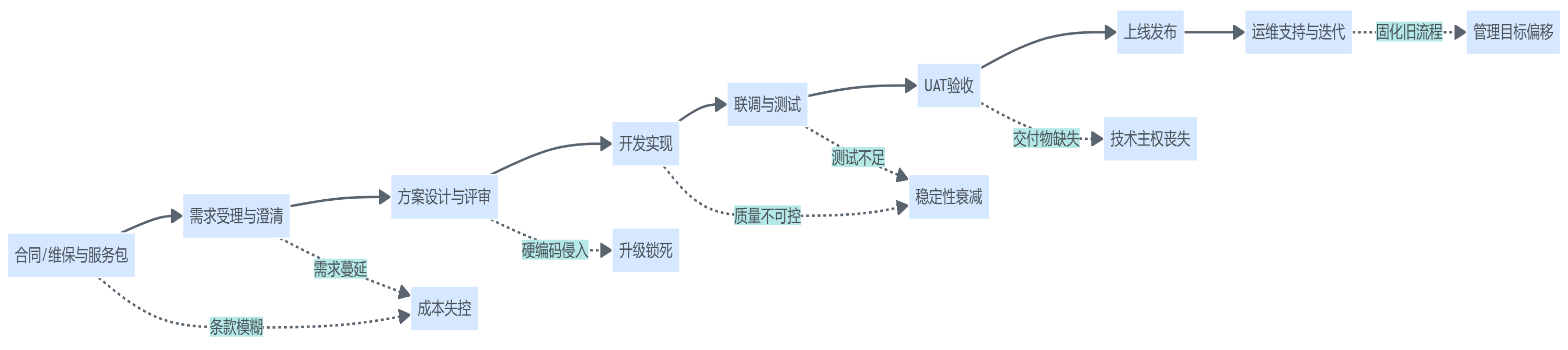 | 技术主权丧失 | 黑盒交付、文档缺失、只有供应商能改 | 供应商绑定、运维成本飙升 | 验收交接、人员流动 |