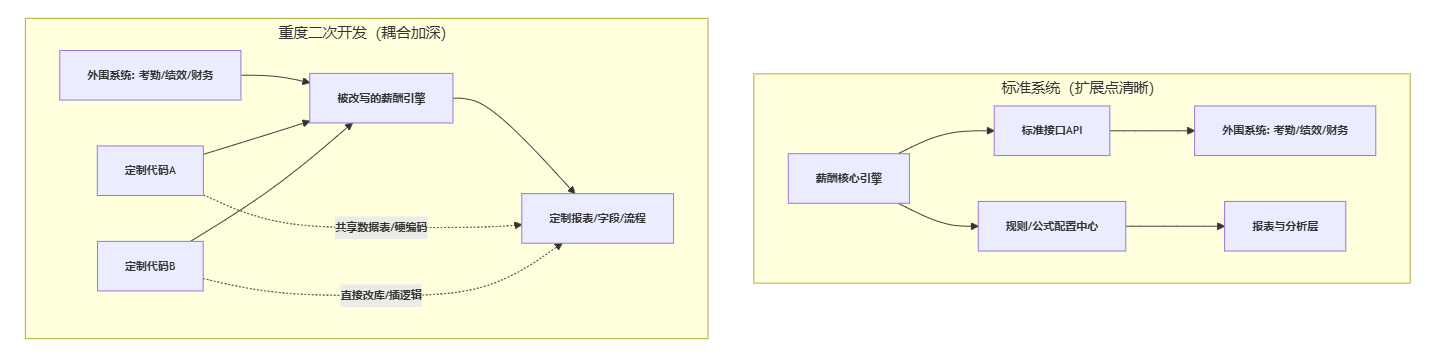 - 高耦合带来连锁反应:当二开直接侵入主干逻辑,一个小改动可能影响多个薪资项、多个报表口径,故障扩散更快。