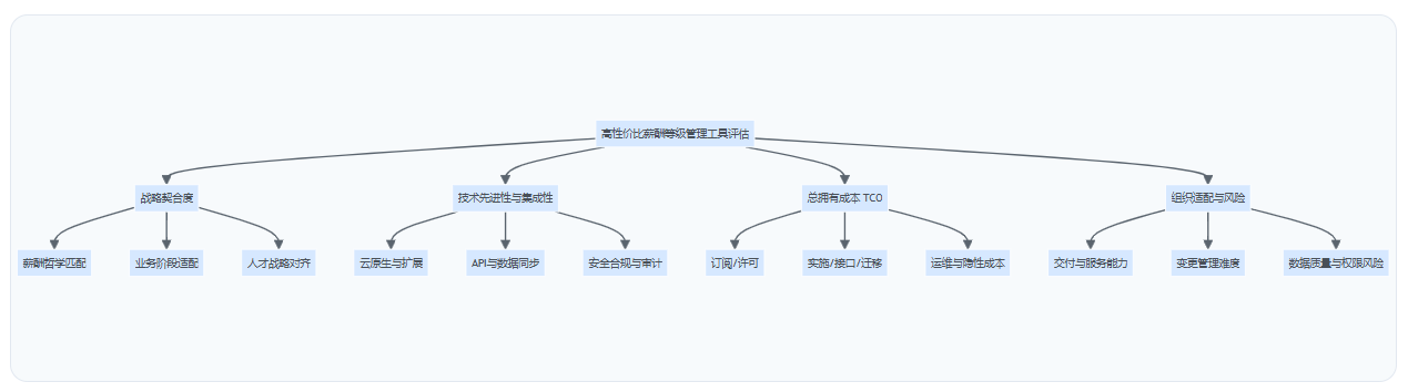 要回答“性价比最高的薪酬等级管理工具有哪些”,前提是先定义“性价比”怎么衡量。我们建议用四个维度把决策从“感觉”拉回“证据”:战略契合度、技术先进性与集成性、TCO、组织适配与风险。