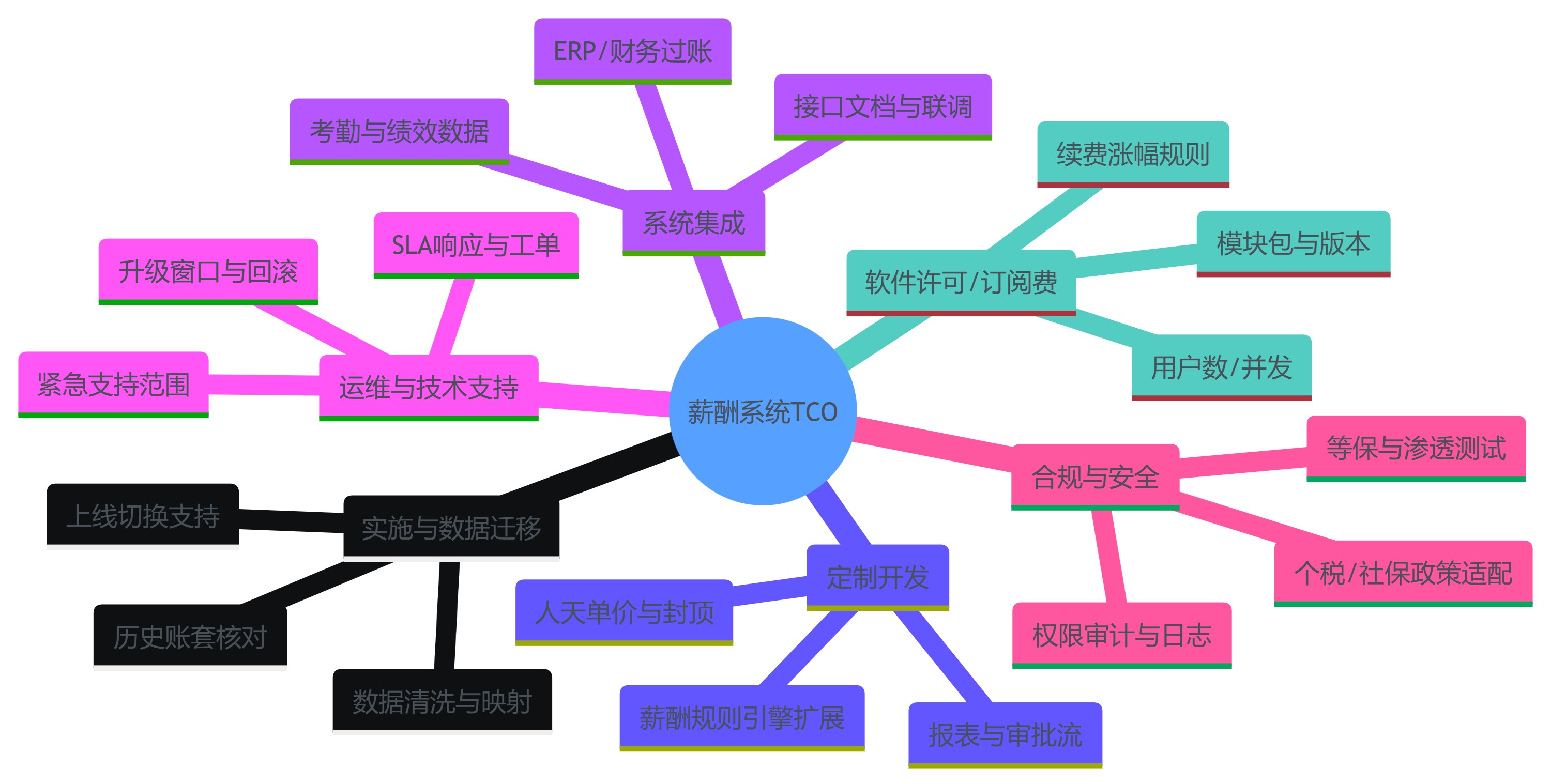 TCO不是财务口号,而是一张可执行的费用清单。对薪酬系统而言,我们建议至少把费用拆成六类,并在采购阶段形成“费用字典”(每一项的定义、触发条件、计价方式、验收口径、上限与例外)。这样做的直接好处是:当售后提出收费,你能迅速判断它属于哪一类、是否在合同范围内、是否触发了变更流程。