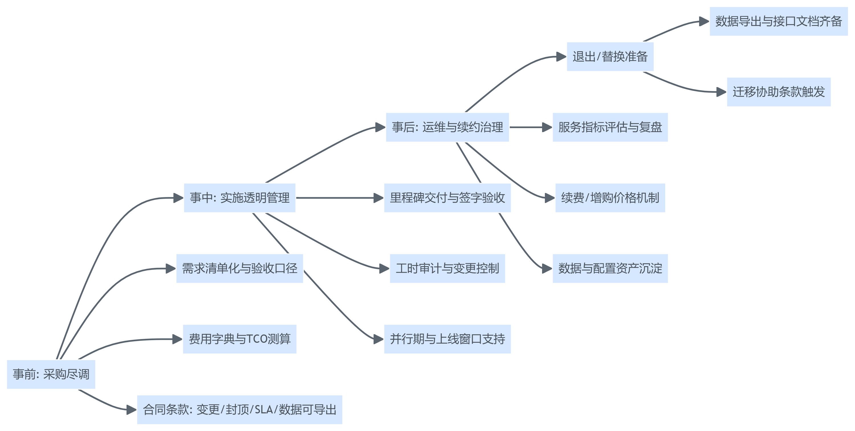 需要提醒的是,TCO拆解并不等同于“把所有风险都推给供应商”。更合理的做法是:把必然发生的工作显性化,并对高不确定项设置上限与边界。例如定制开发可以采用“里程碑交付+阶段封顶+可复用资产归属”的组合,而不是单纯压低人天单价。