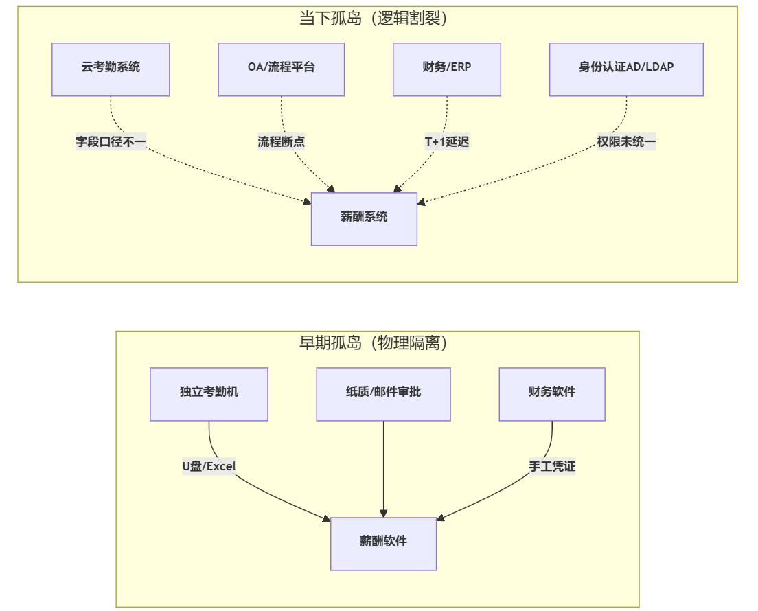 薪酬系统的“孤岛”并不等同于接口没打通那么简单,它更像一个综合症:数据能流动但不一致、流程能跑但无法闭环、权限能开通但不可追溯。换句话说,孤岛不是一天形成的,而是上线前后多个决策叠加后的结果。
