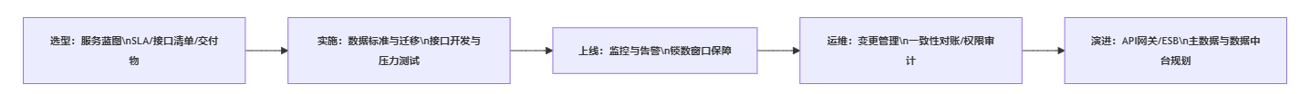 - 演进路线:从点对点走向可治理的集成层(API网关/ESB)或主数据平台,逐步把“口径一致”前移到源头。