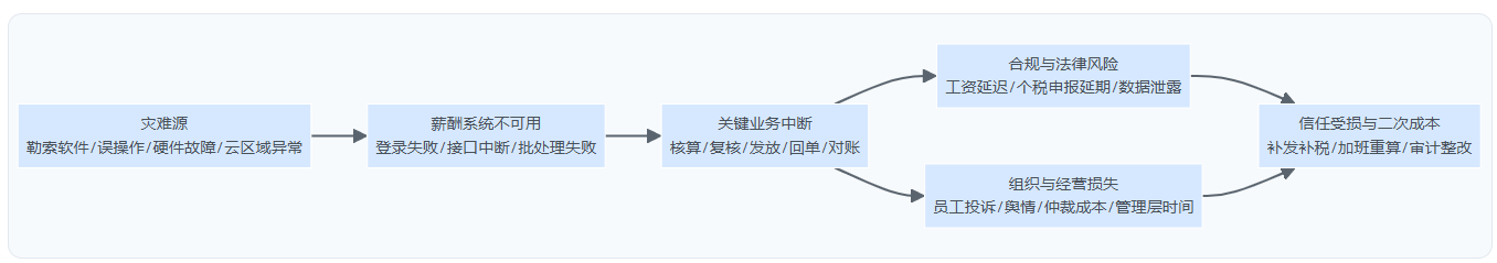 在预算谈判中,灾备常被归类为“可压缩成本”:系统现在跑得好好的,为什么要做双活、做异地容灾、做演练?这种判断忽视了薪酬系统中断的损失结构——它不是单一维度的IT损失,而是合规、法律、组织与经营的叠加。