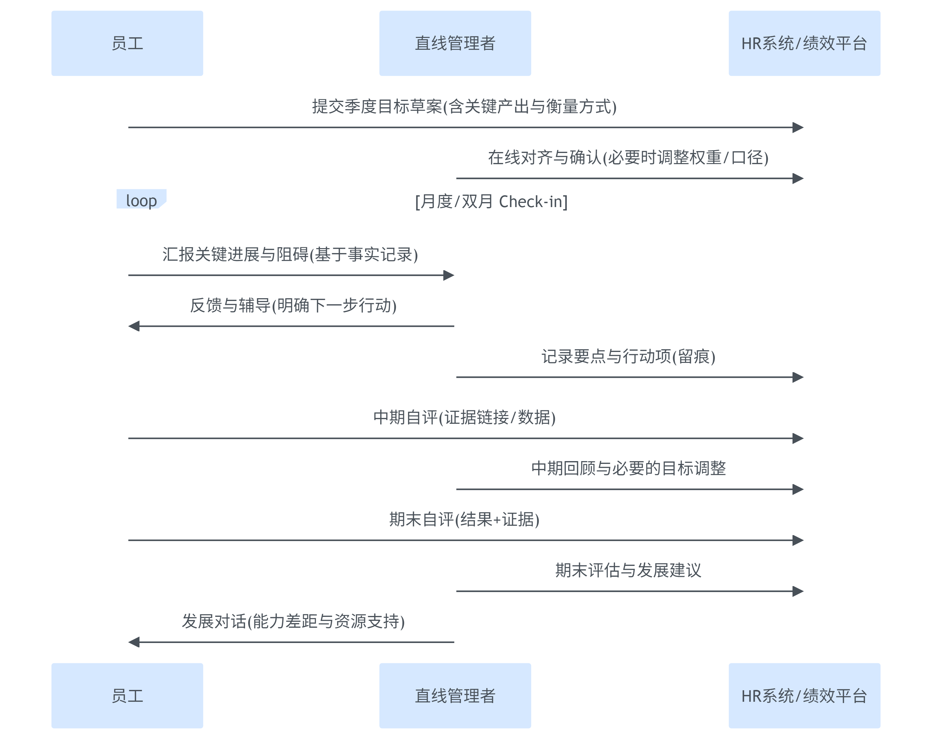 | 持续对话(CPM) | 固定节奏Check-in;每次输出行动项;中期允许目标校准 | 目标库、反馈记录、提醒机制 | 争议前置化解;结果可预期 |
