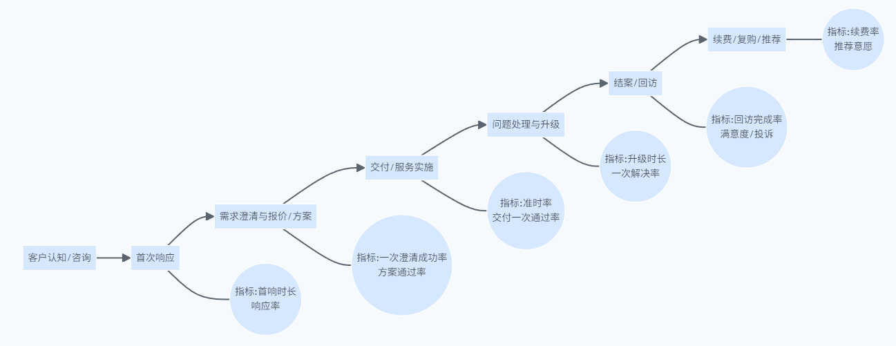 - 触点层:首响时长、一次解决率、回访完成率、交付准时率