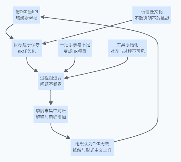 | KPI化 | KR任务化、目标保守、创新减少 | 认知重构 | 定义OKR/KPI边界、弱绑定或阶段性解耦 |