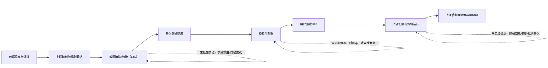 - 实施与迁移:按数据对象与历史年限量化;把UAT轮次、导入批次写入范围。