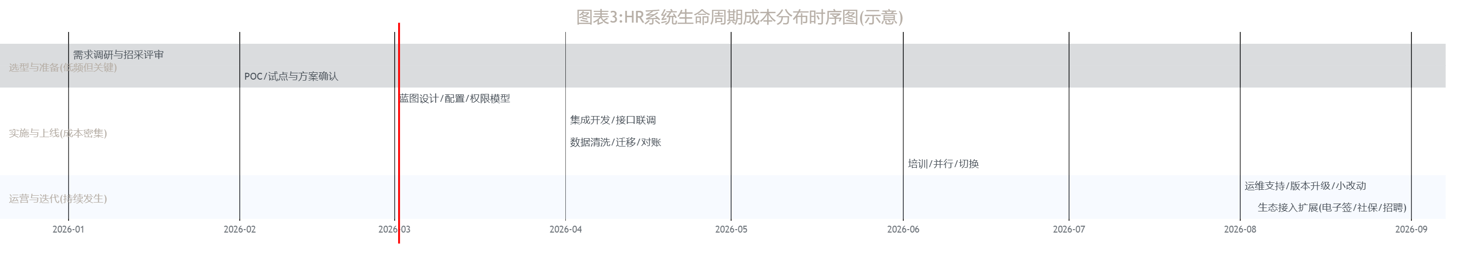 再看时间维度:隐形成本往往不是一次性爆发,而是在“上线前后12个月”集中出现,随后以运维与生态费用形式持续存在。用生命周期时序图(甘特示意)更容易解释为什么很多项目“签约时看起来便宜,上线后越来越贵”。