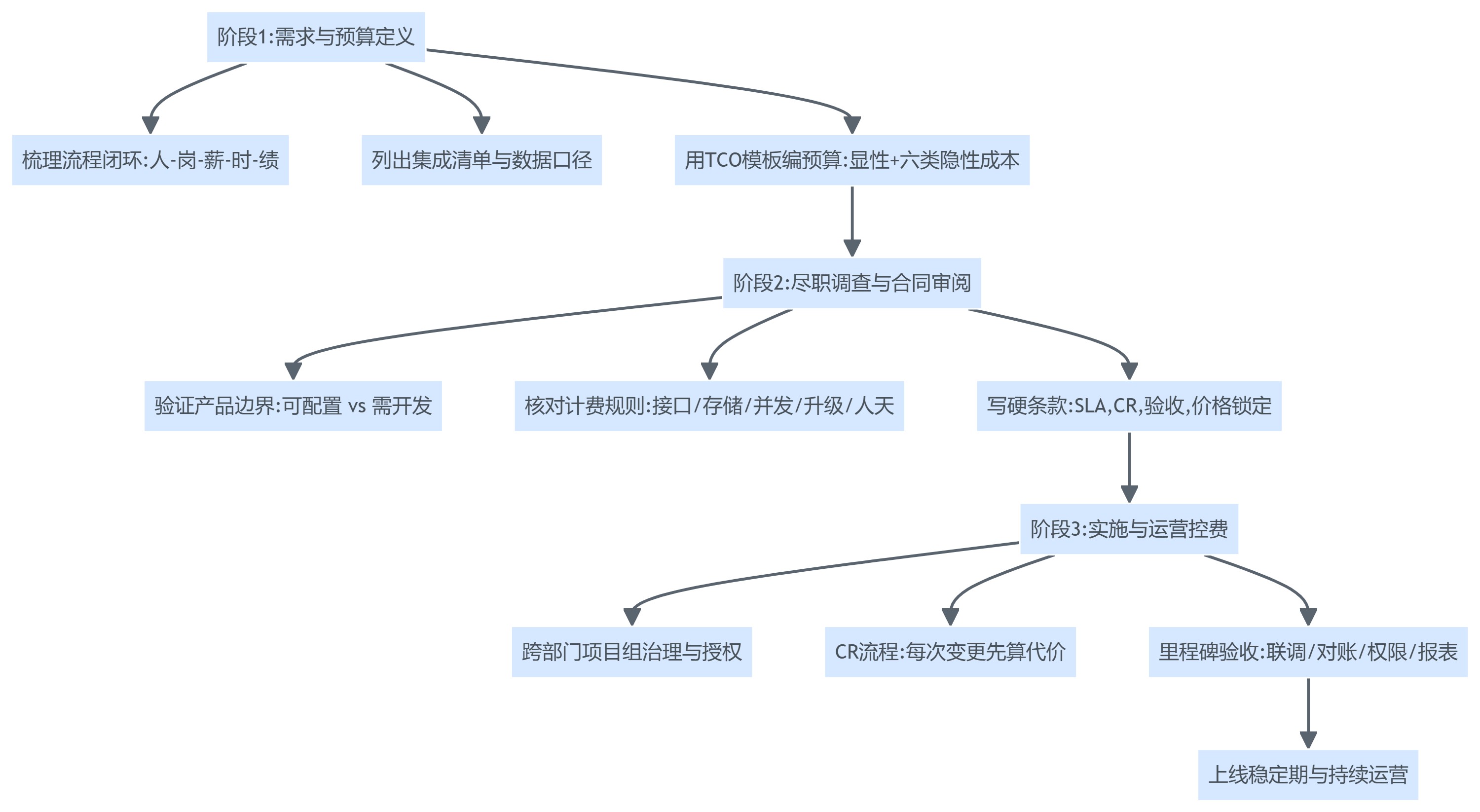 - 隐性成本:定制与集成、数据迁移与治理、实施追加人天、运维升级、第三方生态接口、内部学习与机会成本。