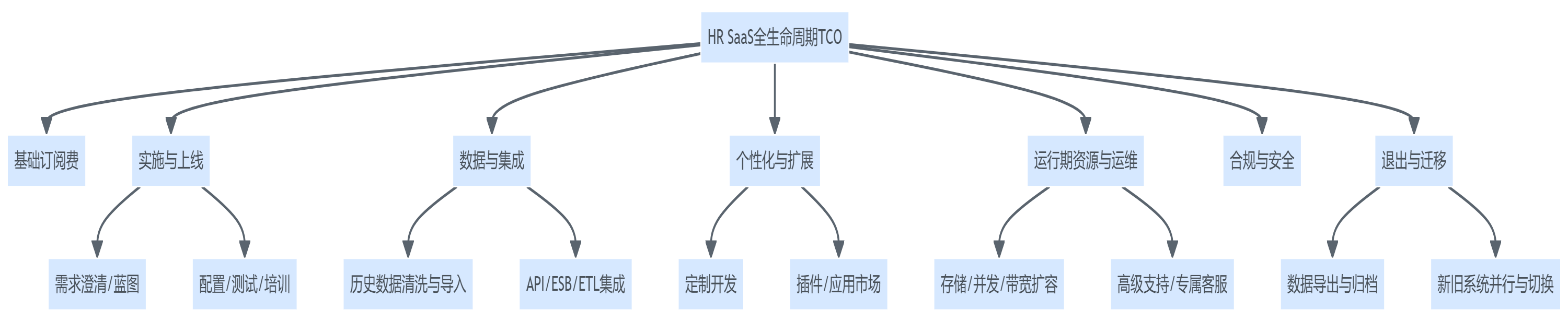 为便于统一口径,本文将HR SaaS全生命周期成本拆成可讨论的结构,后文所有陷阱与对策都能在此结构上找到位置。