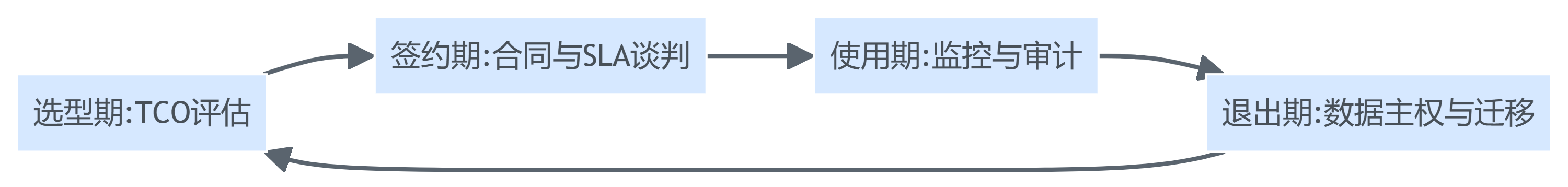 | 合同模糊地带 | 年度调价、服务范围、数据导出等可解释空间 | 高 | 事后难举证;争议处理弱 | 条款参数化;SLA与审计机制前置 |