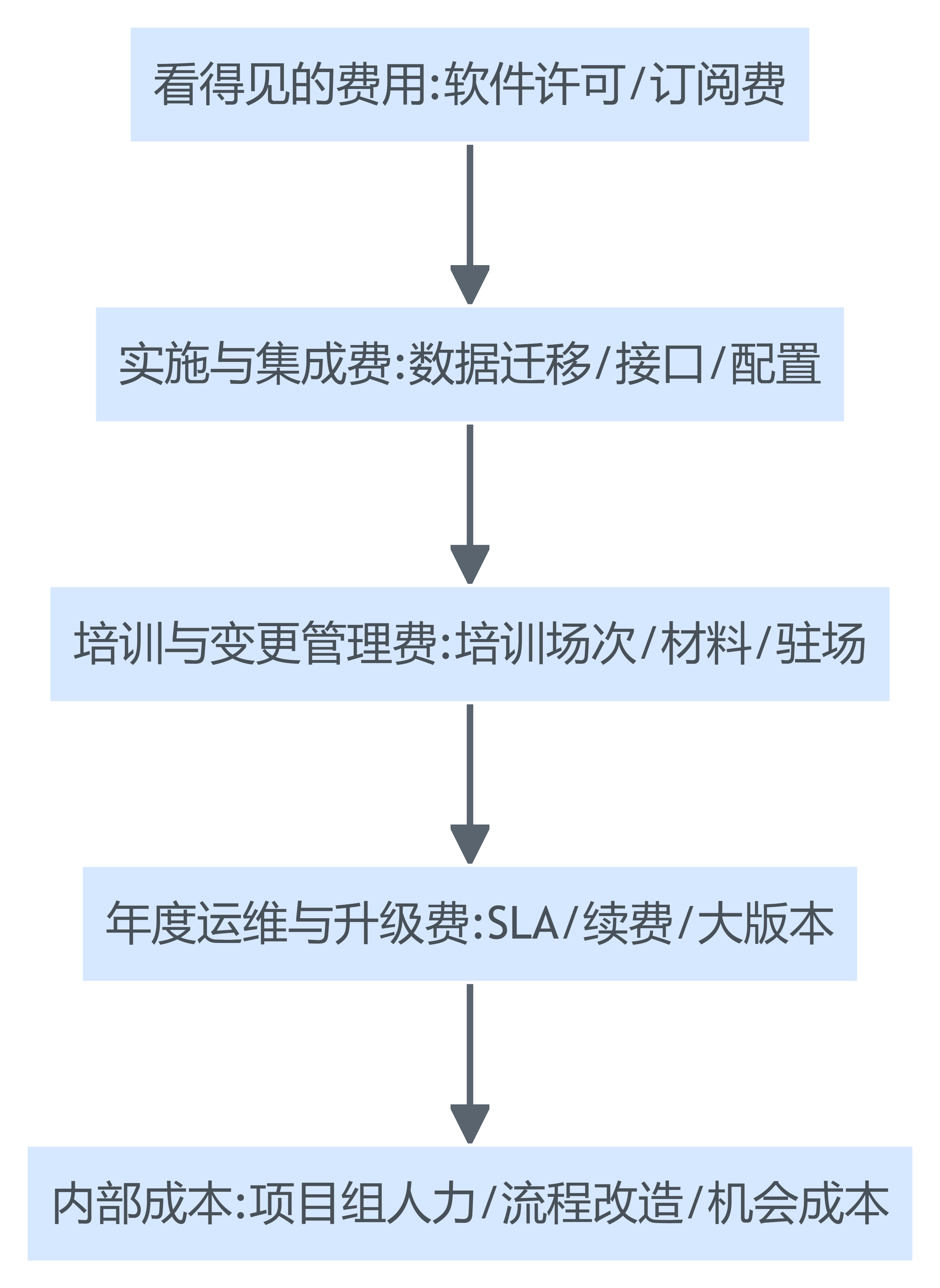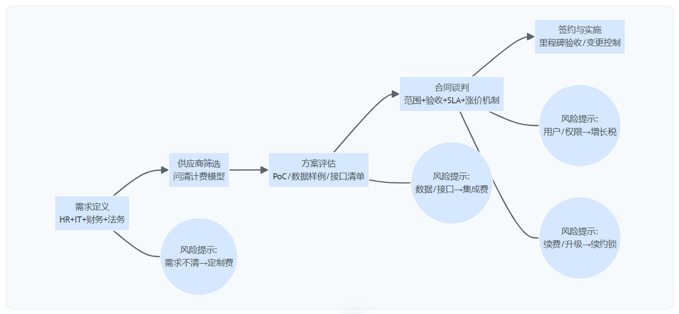 | 实施与集成费 | 数据迁移范围扩大、清洗口径不清;接口闭环未定义;二开需求漂移 | 迁移范围清单+抽检验收;接口对象/字段/闭环定义;变更流程、人天单价与封顶 | 用样例数据与接口清单做PoC;把“口头承诺”转为附件;设置变更阈值需重新审批 |