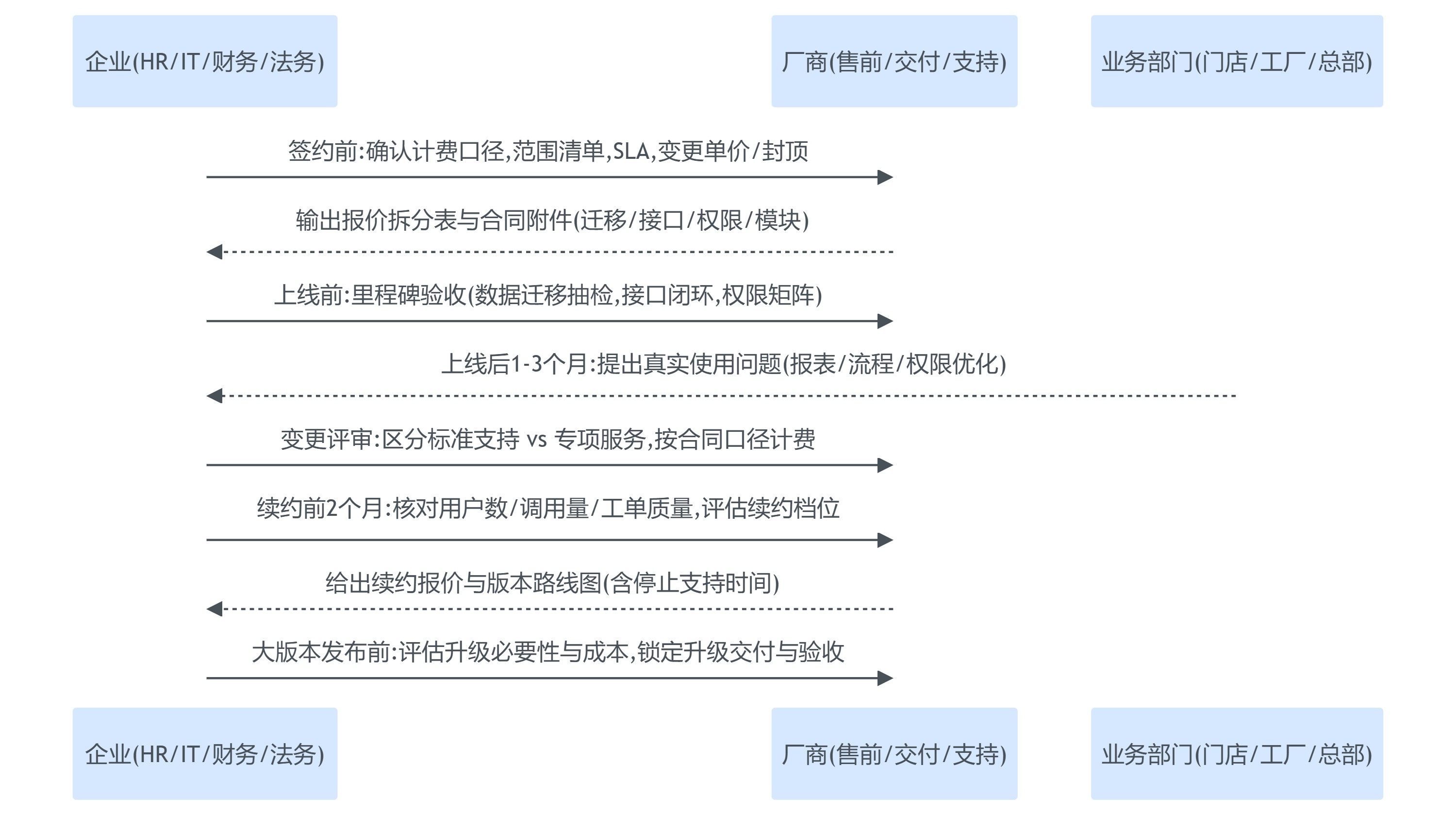 | 运维与升级续约锁 | 续费涨价、支持降级;P1事件需要额外付费;旧版本停服被迫升级 | SLA响应/解决时限与分级;服务包含/不包含清单;续费涨幅机制;版本支持周期与升级口径 | 续约前做工单质量与可用性复盘;用SLA与服务边界作为续费谈判依据 |