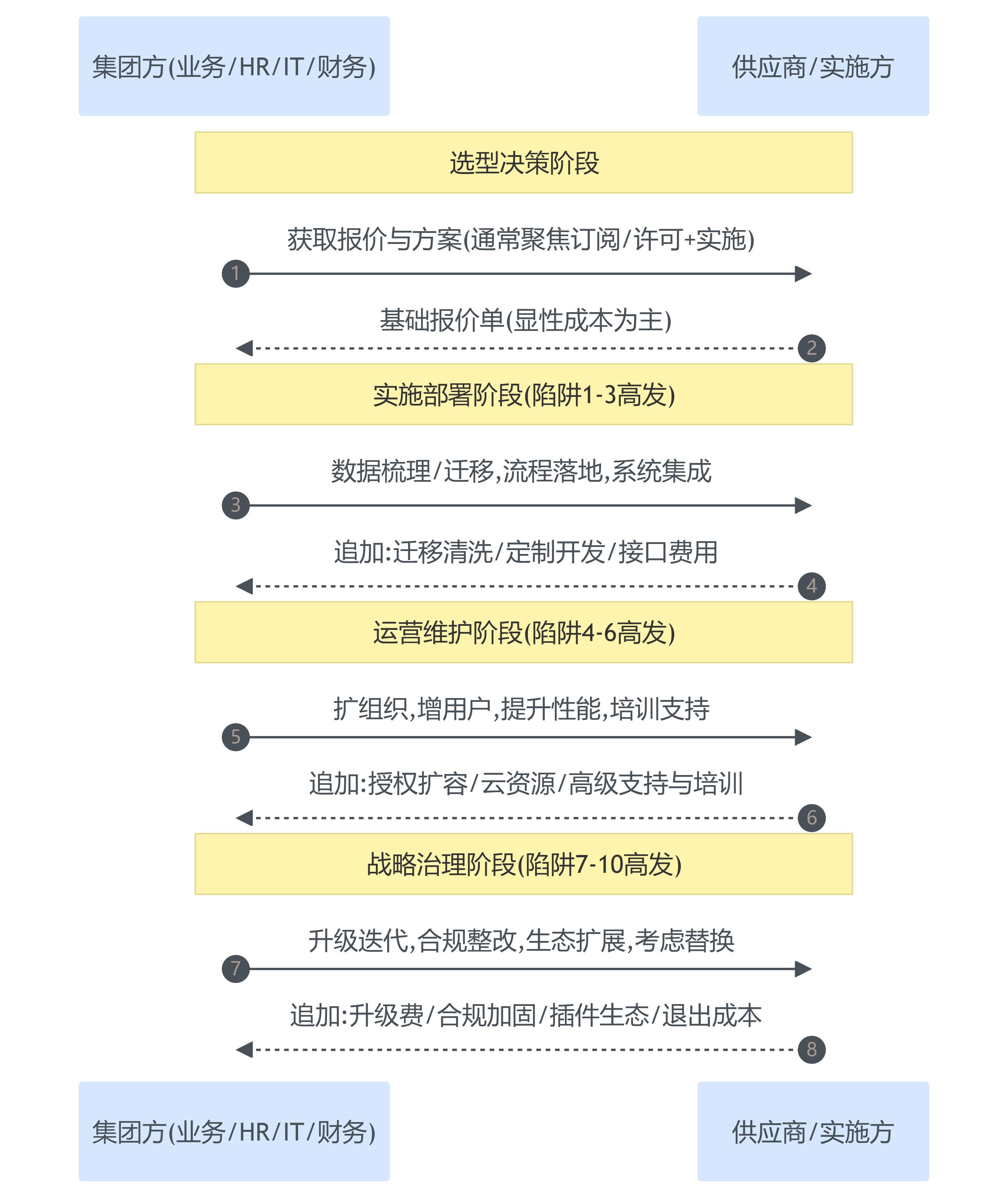 | 实施部署 | 外部系统集成费用 | 供应商:按接口收费;企业:缺少集成蓝图 | 统一主数据标准,接口交付包含监控/异常机制 |