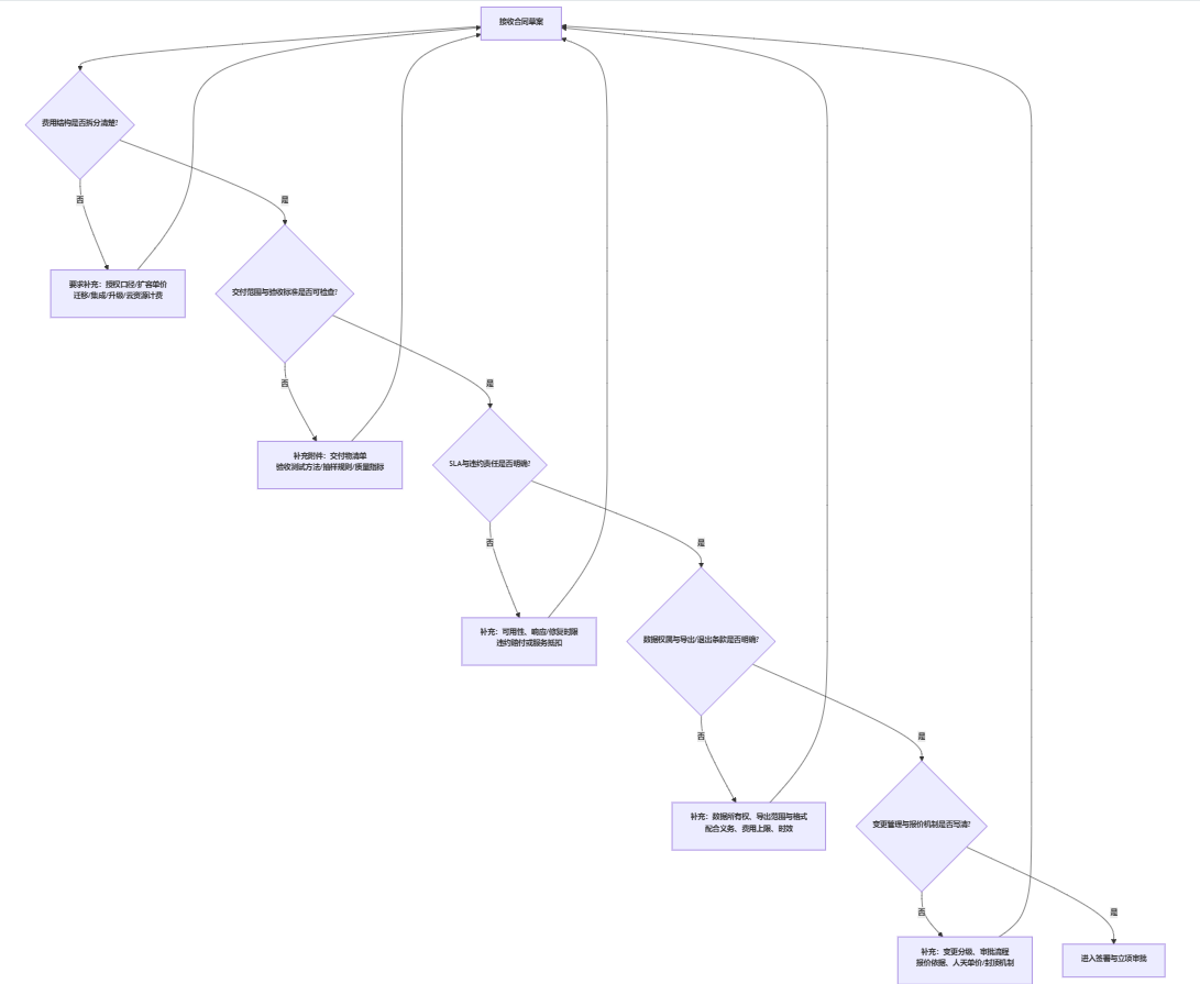 | 运营维护 | 授权扩容费用 | 供应商:按规模计价;企业:增长未纳入谈判 | 阶梯价/封顶条款/新增主体计费口径前置 |