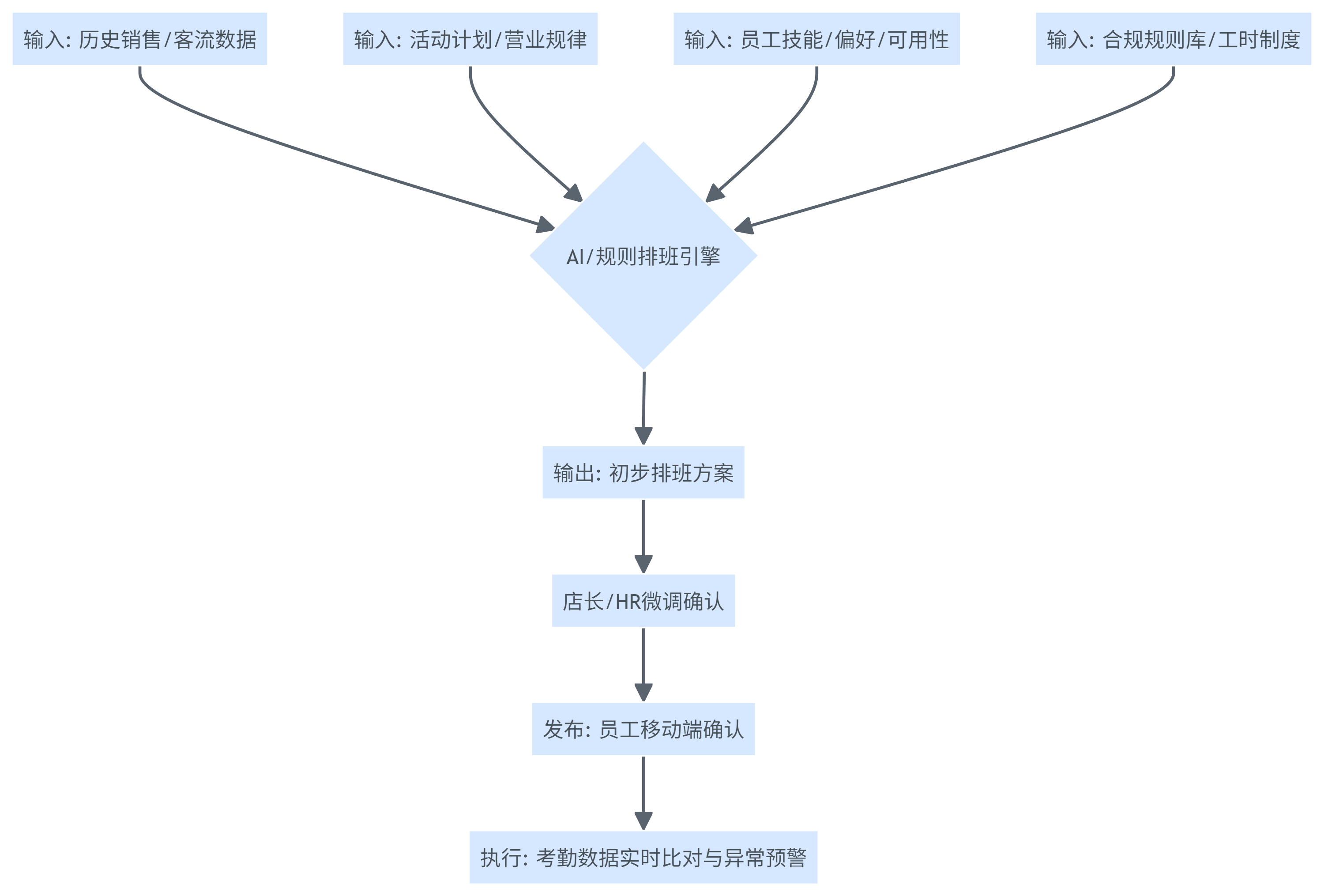 | 排班依据 | 店长经验、口头沟通 | 历史数据+需求预测+规则约束(可叠加偏好) |