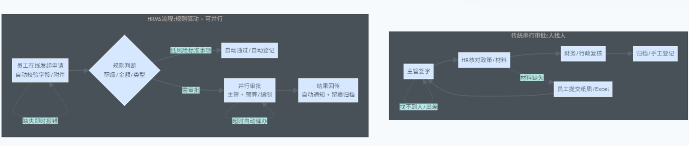 (图表1:传统审批流程 vs HRMS自动化审批流程)
