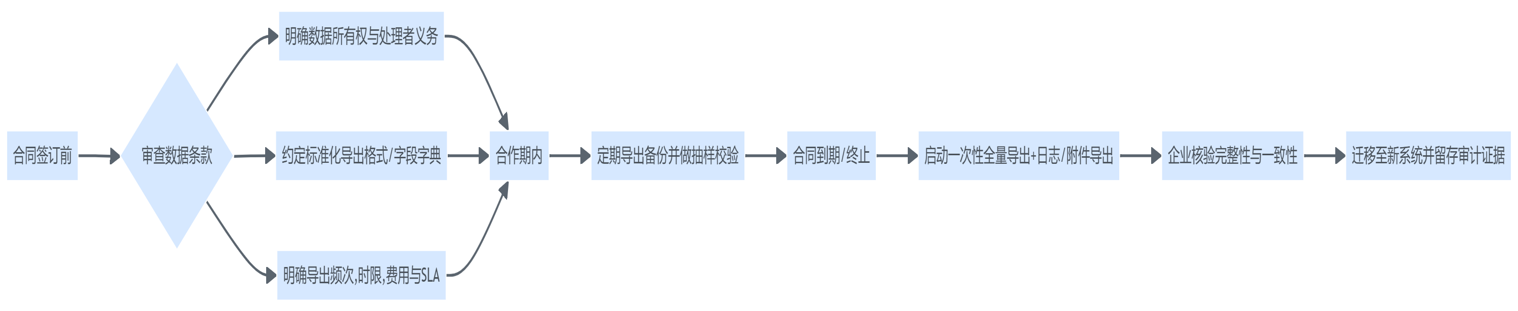 - 把数据退出当作交付的一部分:数据范围清单、结构化格式、字段字典、只读期、到期导出次数与SLA写入合同,避免“另行协商”。