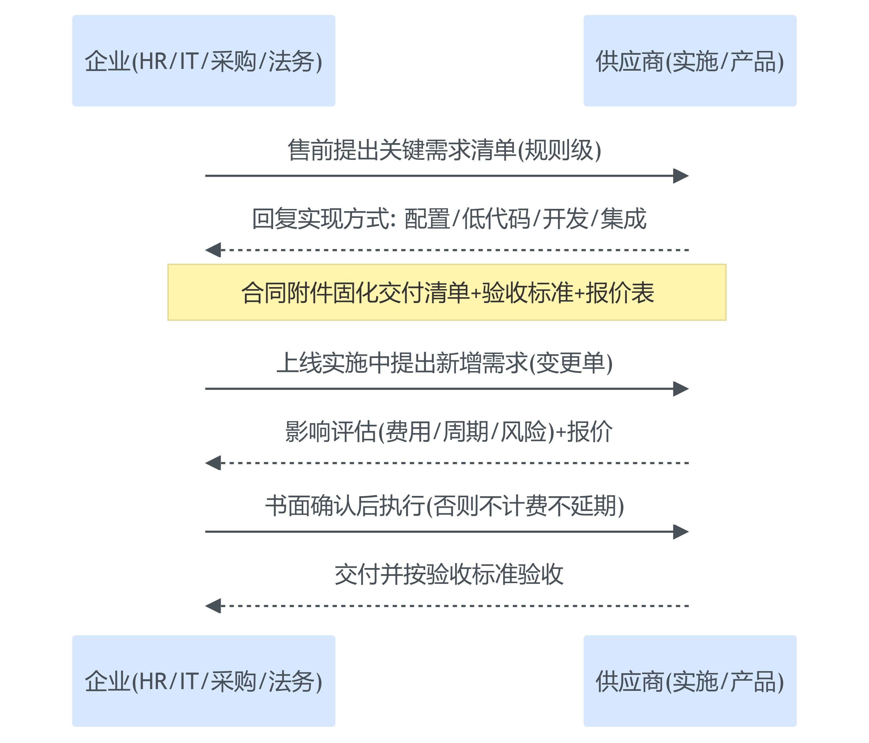 | 实施与验收 | HR/IT | 交付清单、验收标准、变更单闭环、接口联调记录 | 验收报告+变更台账 |