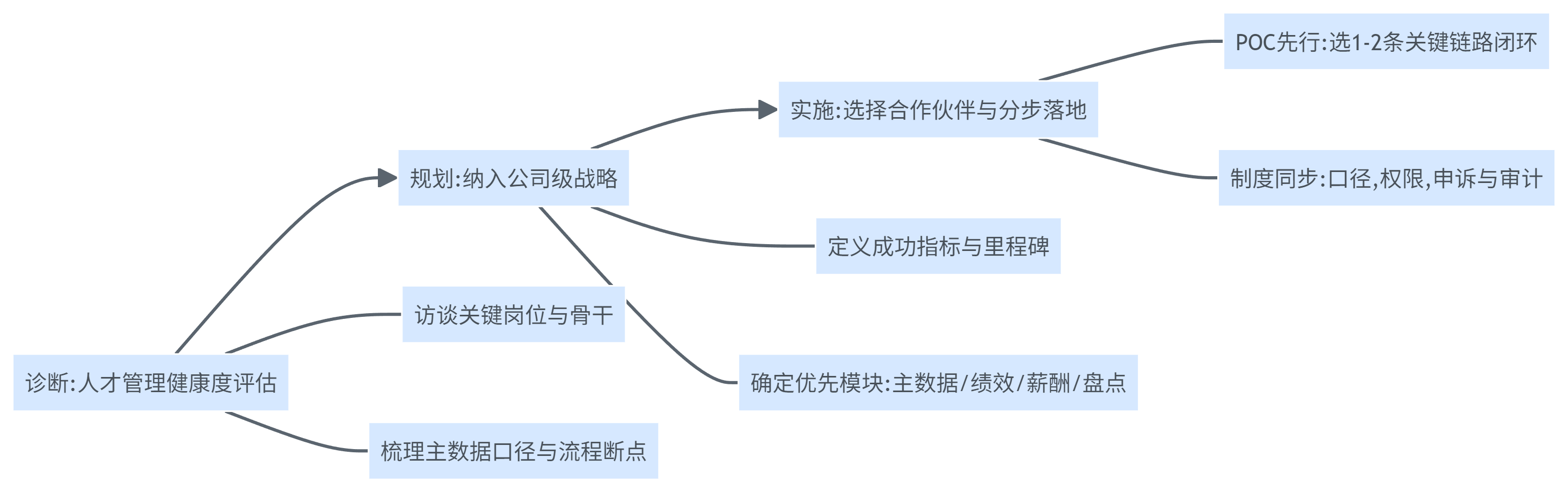 总的来说,它会让决策缺证据、体验缺闭环、文化缺落点,最终把可管理的流动变成不可控的失血,而对2026年的互联网公司来说,是否建设HR系统已经不是“要不要上工具”,而是“要不要把人才风险纳入公司级治理”,因此我们建议用三步走把动作落下去:先诊断,再规划,后实施,并把成功指标提前定义清楚(例如关键岗位流失率、绩效校准一致性、入职到产出周期、员工体验关键触点满意度)。