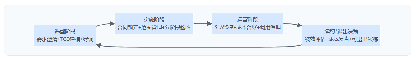 仅靠“避坑清单”能解决一次选型,却解决不了持续运营。更稳妥的做法是把TCO控制做成机制:前置建模、中置锁定、后置监控,让供应商收益与企业结果绑定。