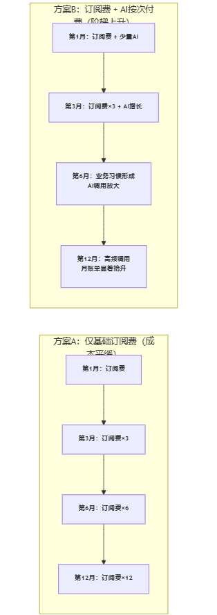 下面用一个可渲染的流程对比图,展示“仅订阅费”与“订阅费+AI按次计费”在时间维度上的差异(示意,关键在趋势而非数值精确)。