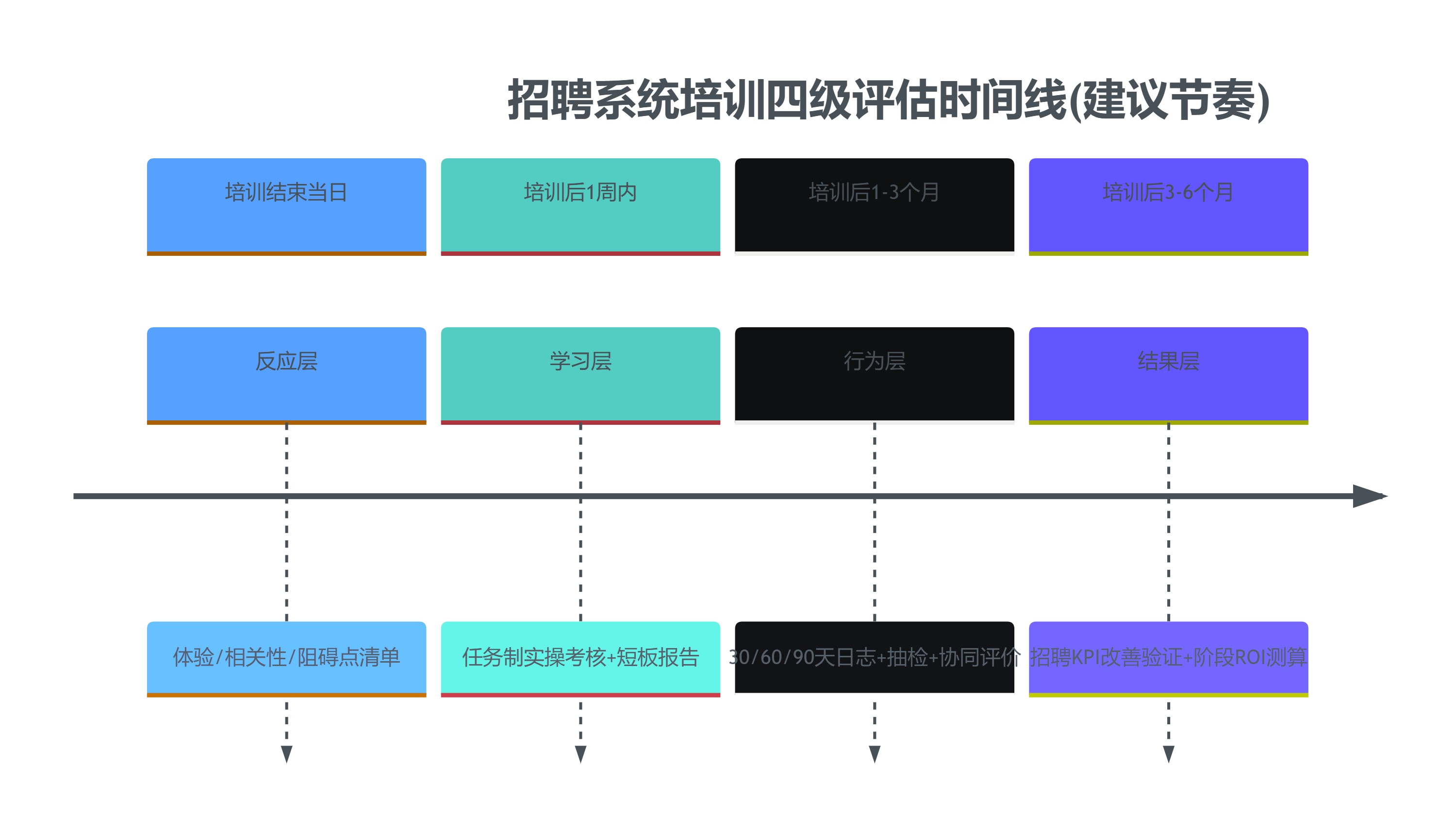 为便于管理层理解四级评估的时间跨度,建议用一条时间线表达“何时评什么”。