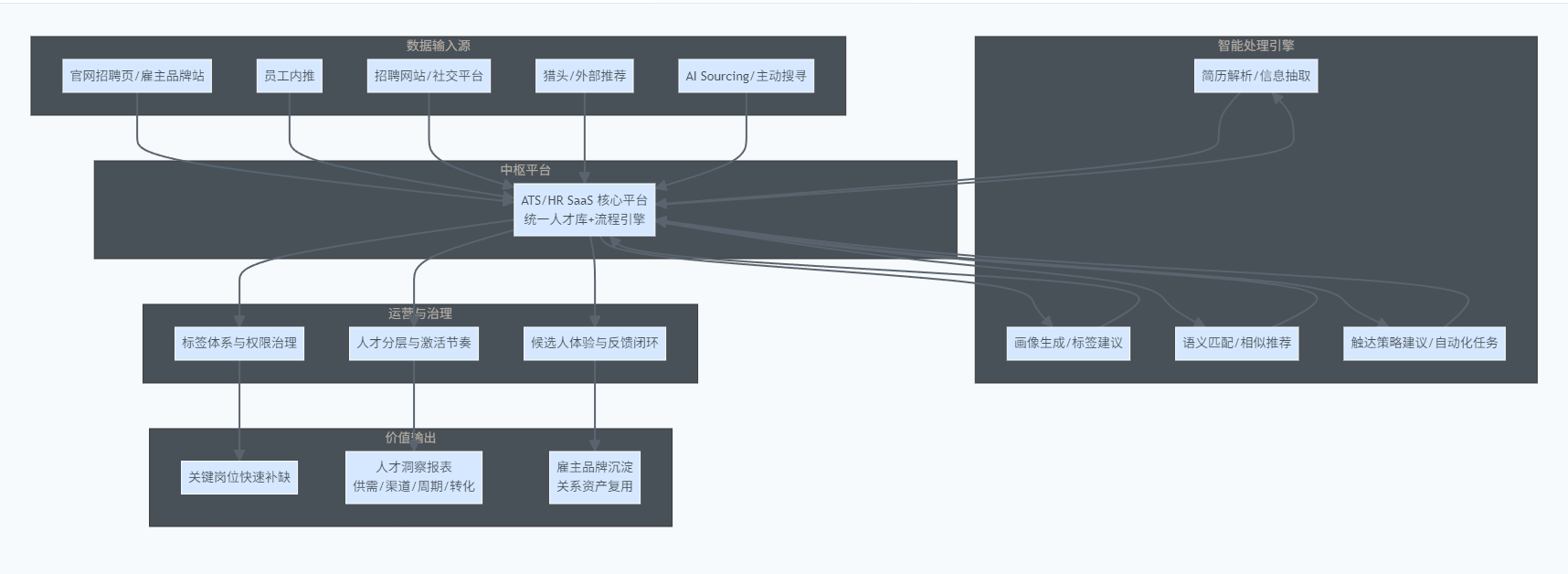 传统人才库常见痛点是建而不用,背后原因并不复杂:信息不完整、标签不统一、搜索匹配弱、跟进记录分散在邮箱/Excel/IM里,最终无法在关键时刻快速调用。反之,ATS/HR系统可将招聘流程从“人的记忆”迁移到“系统的记录”,再叠加AI能力,形成新的机制链条: