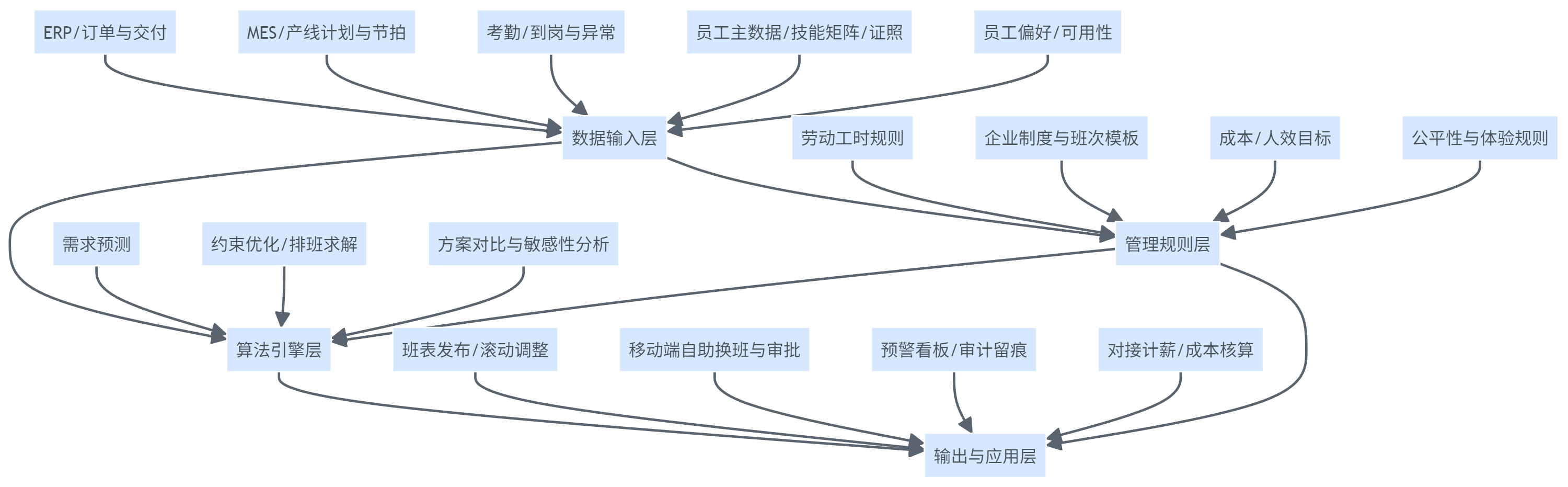 制造企业在选系统时,经常被“AI排班”吸引,但需要追问:AI解决的到底是哪一段问题?从系统结构看,技术引擎至少包含三层能力。