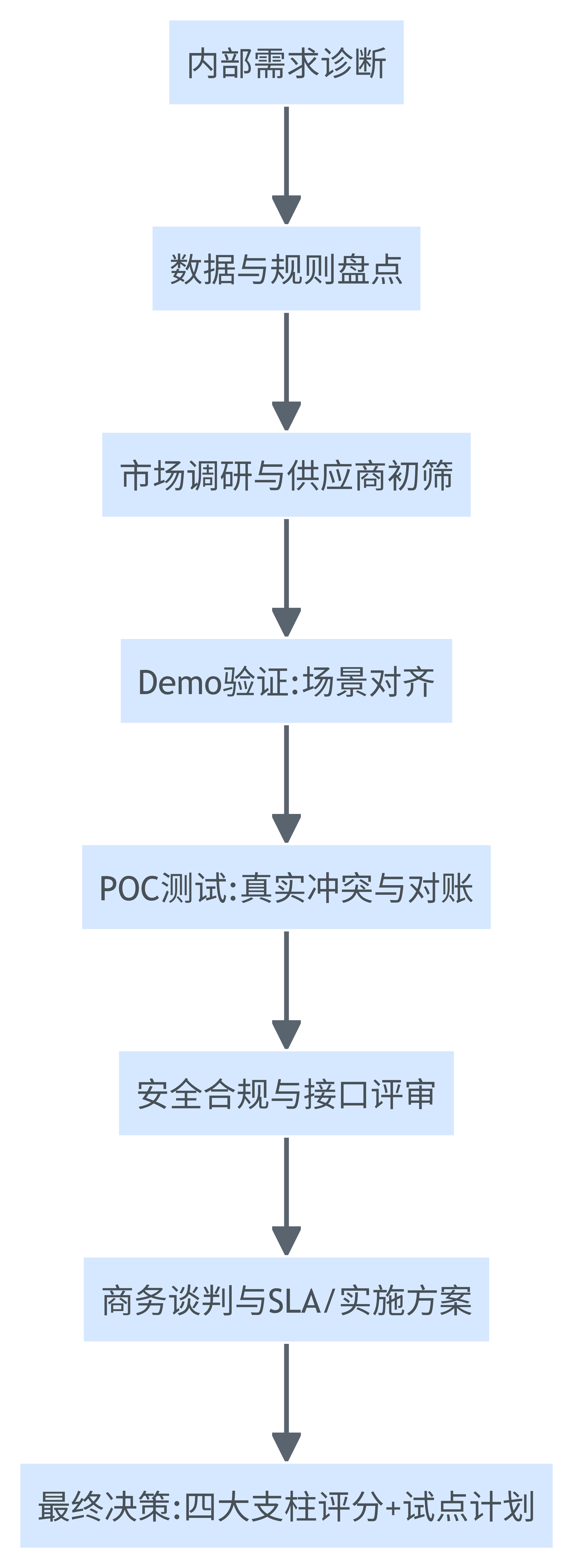 | 战略契合度 | 系统能否支撑交付/成本/质量的优先级? | 指标口径对齐+试点目标书 | 只讲功能不谈指标,或无法给出业务场景方案 |
