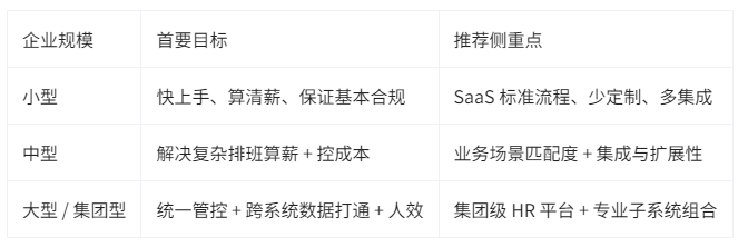 不同规模和阶段的制造企业,在 HR 系统选型上的侧重点差异很大。用同一把尺子衡量,往往会导致要么“杀鸡用牛刀”、要么“轻装上阵却顶不住业务”。