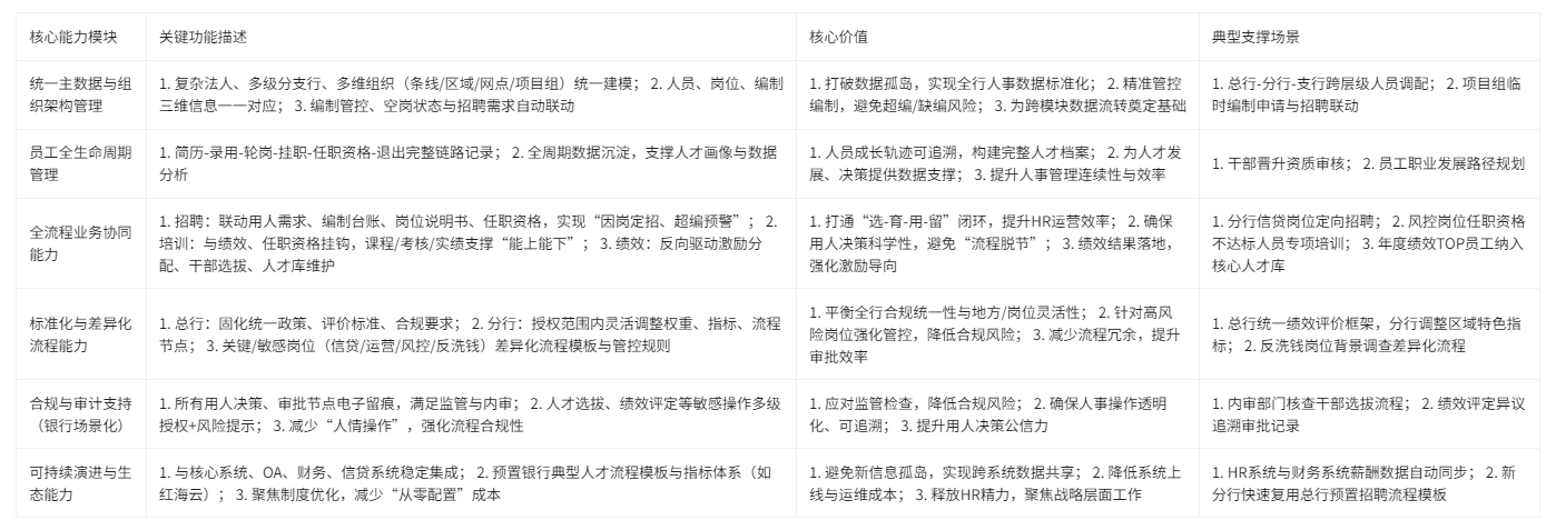 - HR BI 与决策分析:打通人力成本、编制、考勤工时、绩效结果等数据,提供高管数据驾驶舱、人力成本分析、人才配置分析、管理效率分析,以及自由报表、自由图表、自由门户,支撑总行与分支行的人力预算、用工合规分析。