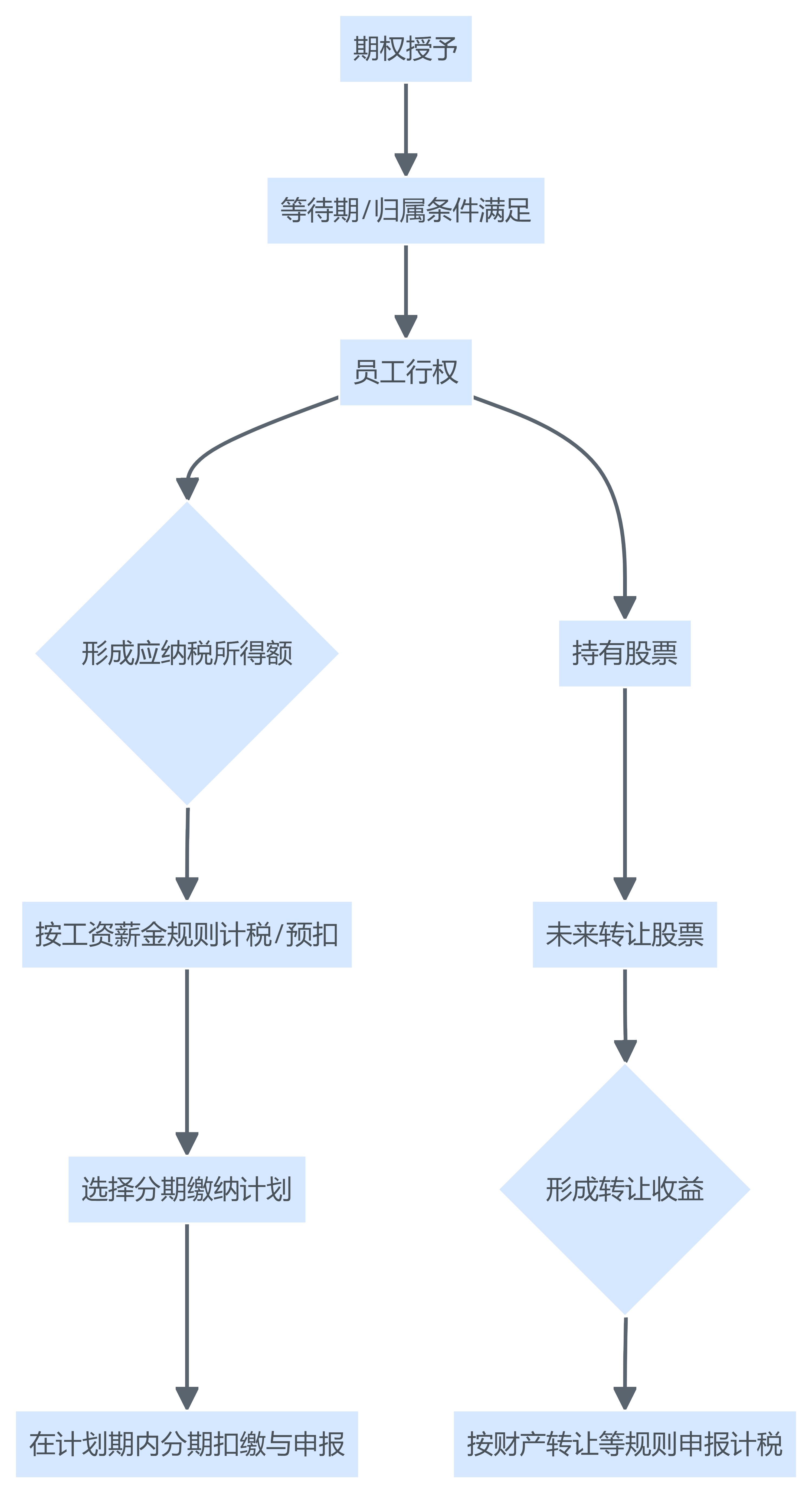 这里的关键不在流程图本身,而在流程背后的“系统要求”:每个节点都需要数据字段、业务状态、凭证留存与合规校验。提醒一句:如果系统只能记录“发了多少期权、扣了多少税”,而无法记录“为什么此人采用该计税路径、分期计划是什么、变更如何处理”,在2026年的监管与内部审计语境下就很难自洽。