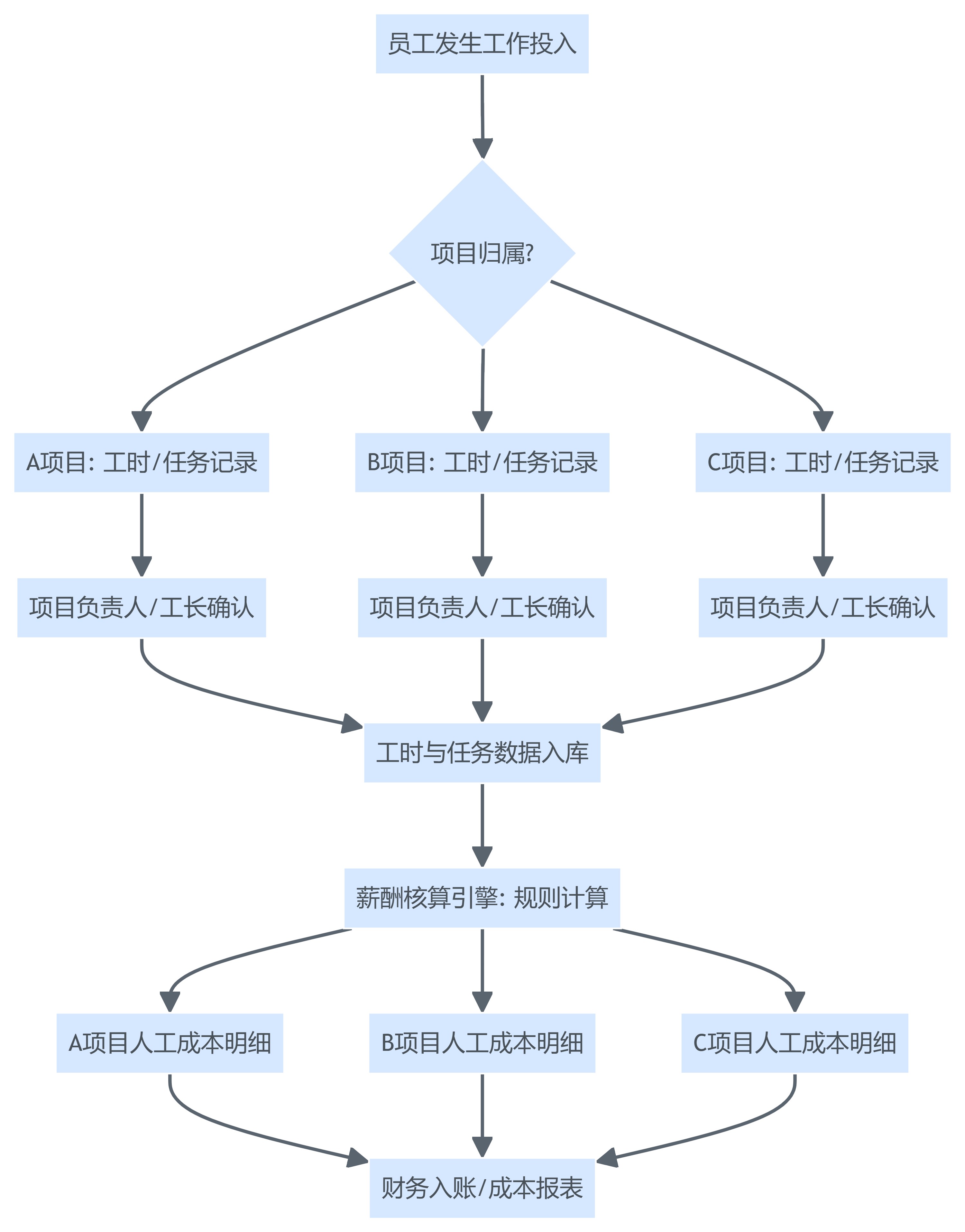 - 手工填比例:HR或项目文员按经验给一个分摊比例(如70%在A、30%在B),月底再调;