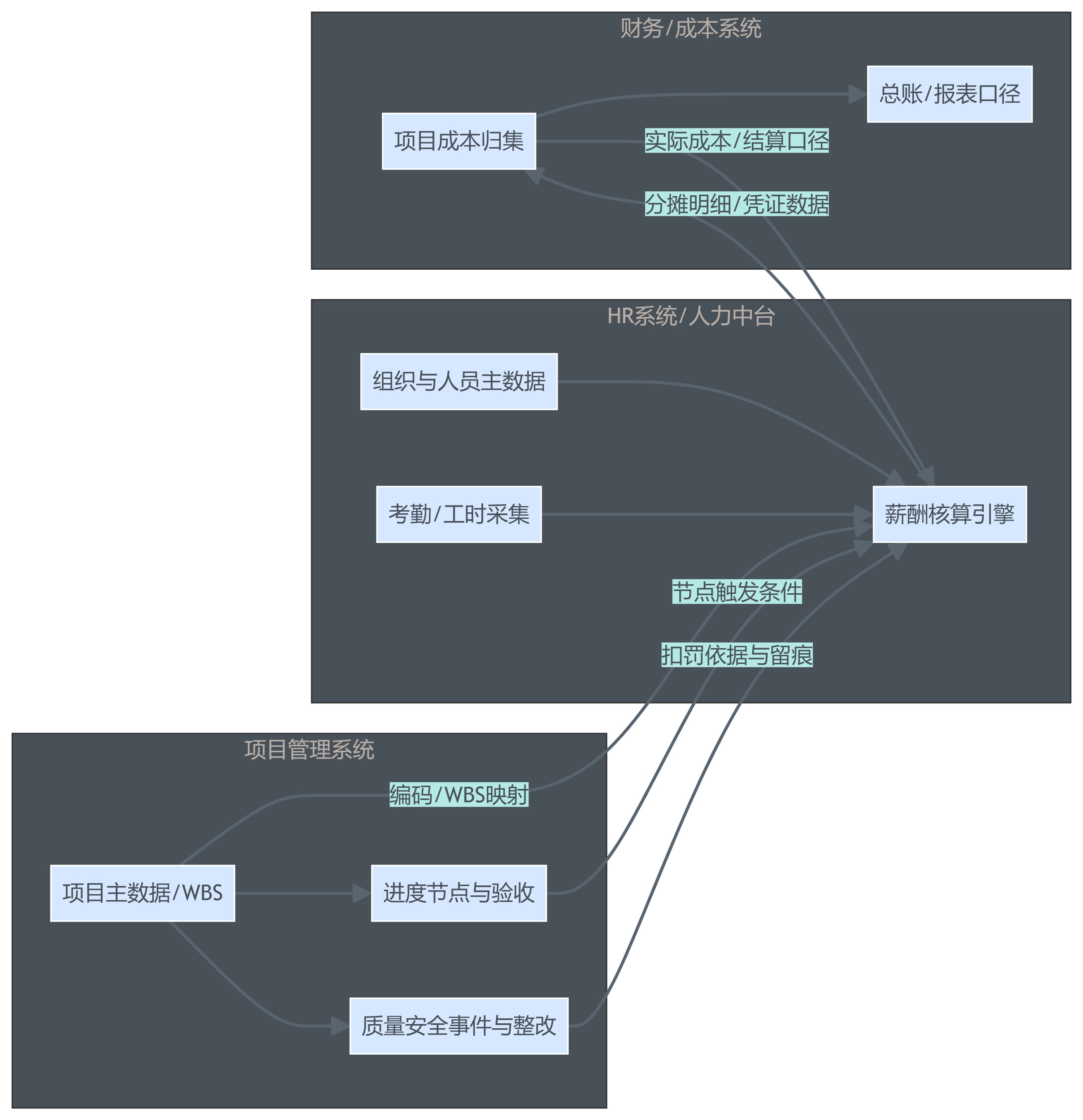 - 统一主数据:项目编码、标段/合同号、WBS层级、成本要素、人员身份(自有/劳务/外协)、岗位/工种编码必须一致,否则后续只能靠手工对齐。