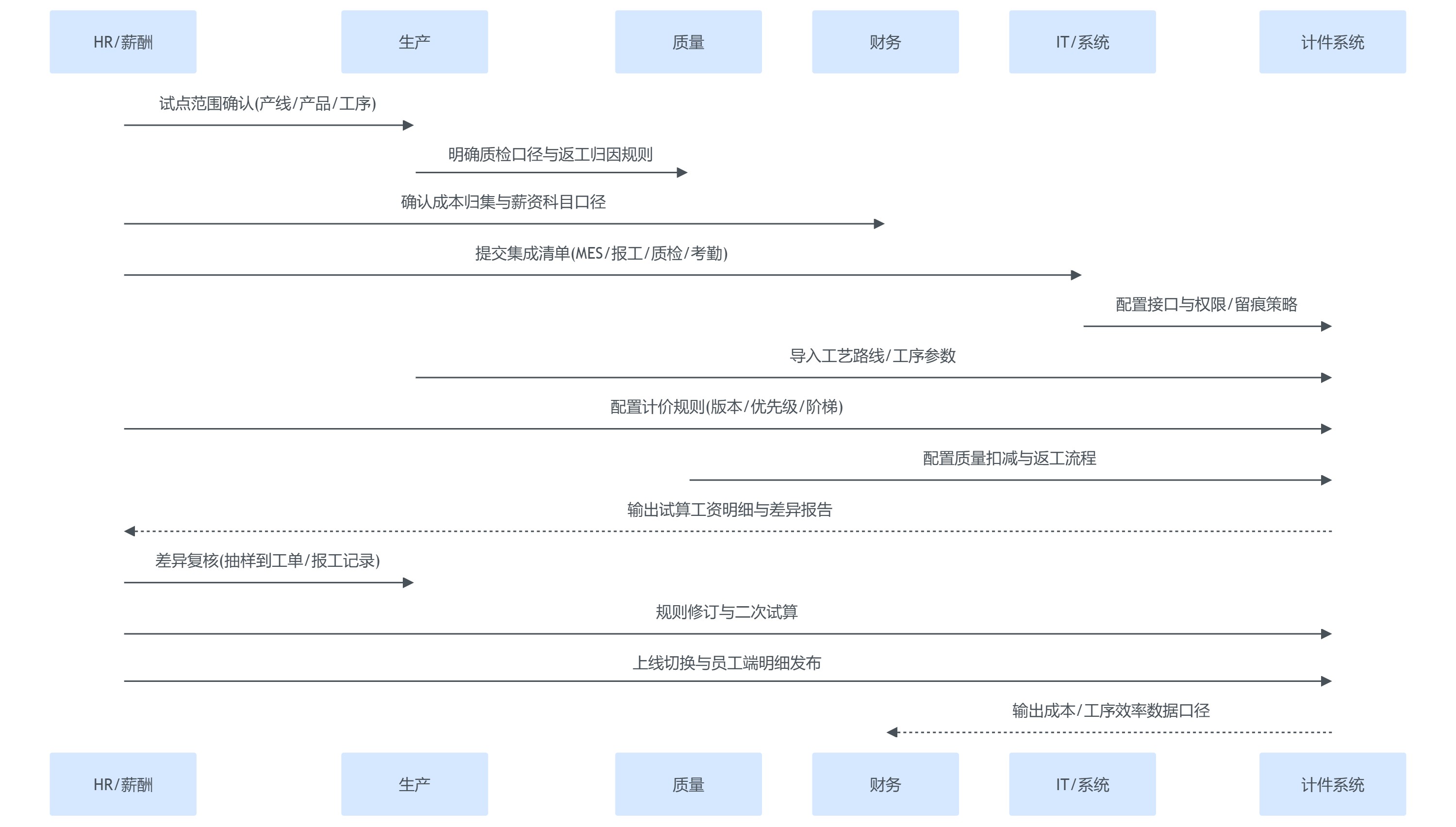 | 第2阶段:扩面推广 | 复制到更多产线;完善返工归因与异常处理;与考勤/加班/补贴联动 | 全厂规则版本管理、异常审批流程、统一工资条明细 | 核算周期、争议率、返工率变化 |