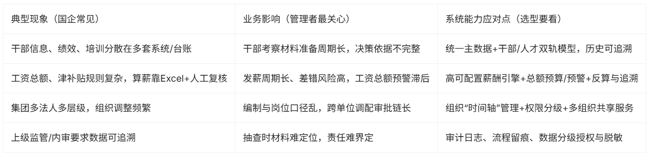 - 专业化组合派更关心“干部与人才管理的深水能力”。他们通常经历过:ERP HR模块能覆盖基础人事,但一到干部考察模型、人才盘点、复杂津补贴反算、跨法人共享服务,就不得不二次开发或再买系统,最终还是形成多套系统并存。