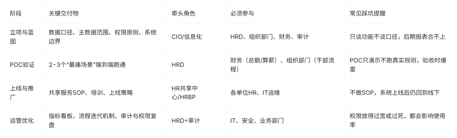 国企项目里,HR牵头很常见,但如果缺少财务、组织部门、信息化、审计的共同参与,系统很容易在“口径”和“权限”上反复返工。下表把关键角色与交付物列清楚,便于直接拿去做项目章程。