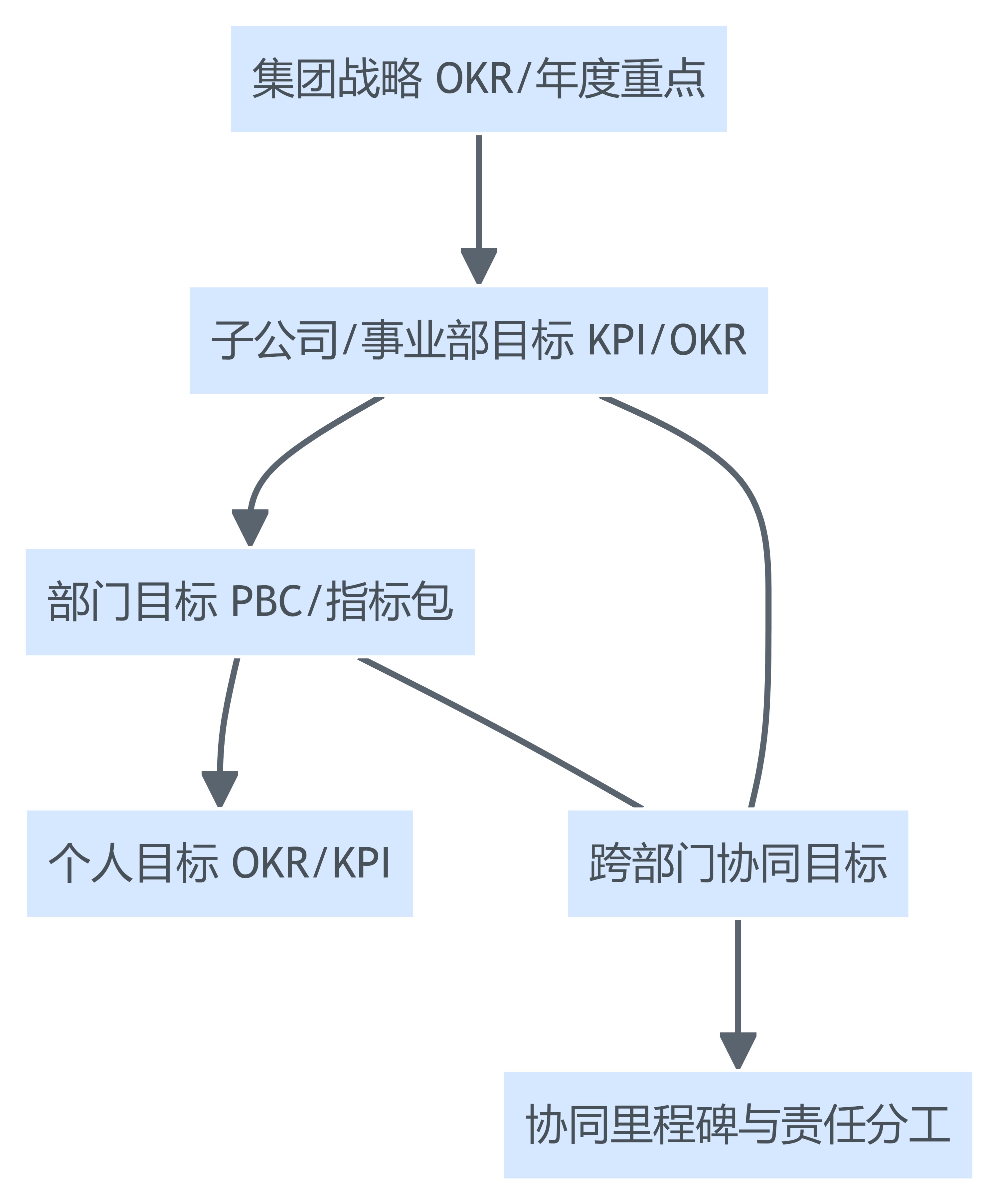 - 纵向穿透:战略主题→关键举措→事业部/子公司→部门→岗位,承接链条必须可视化、可追溯;