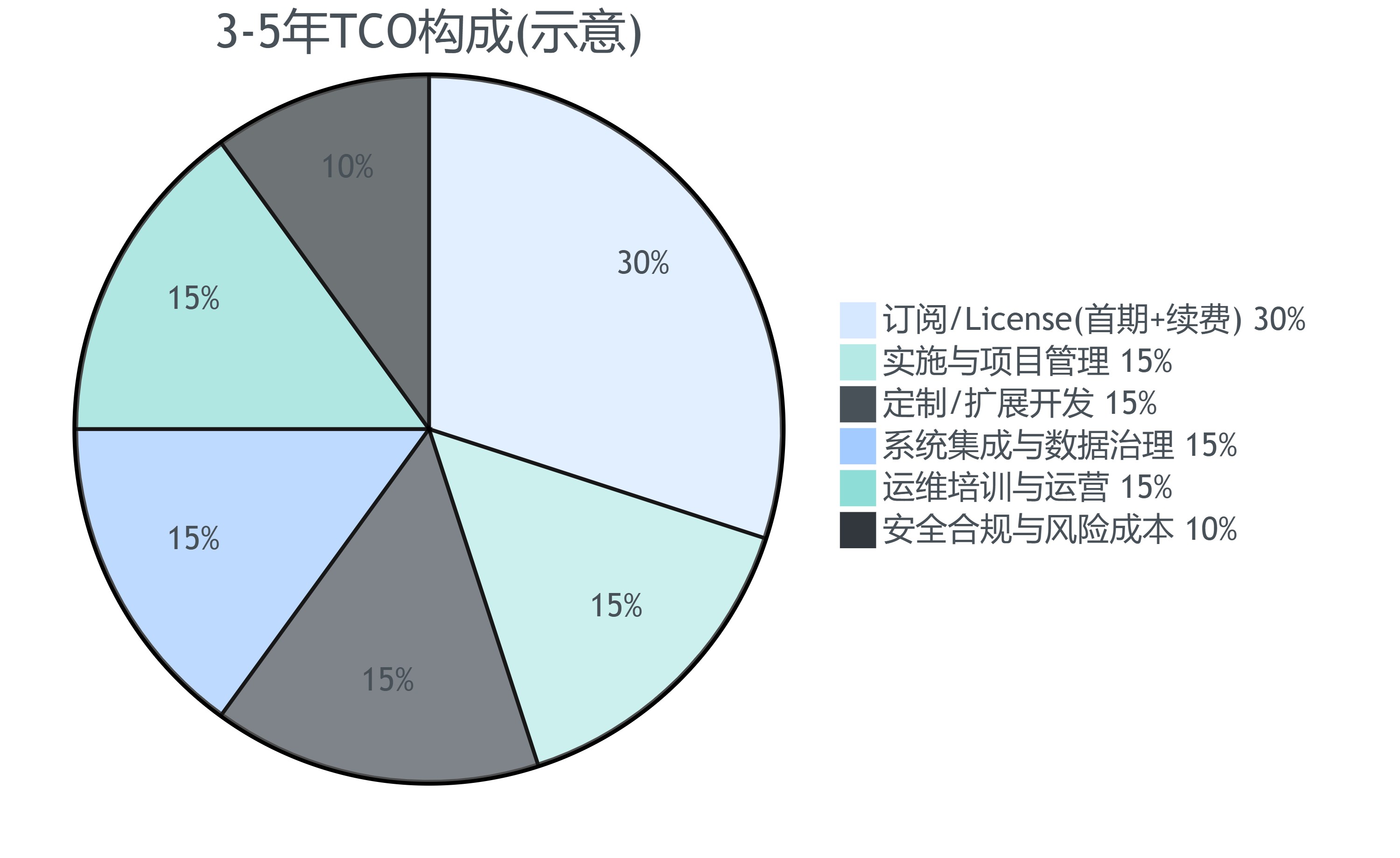 | TCO结构 | 咨询/实施/运维占比高 | 订阅+增购+集成易成为大头 | 定制与运维成本不确定性更高 |