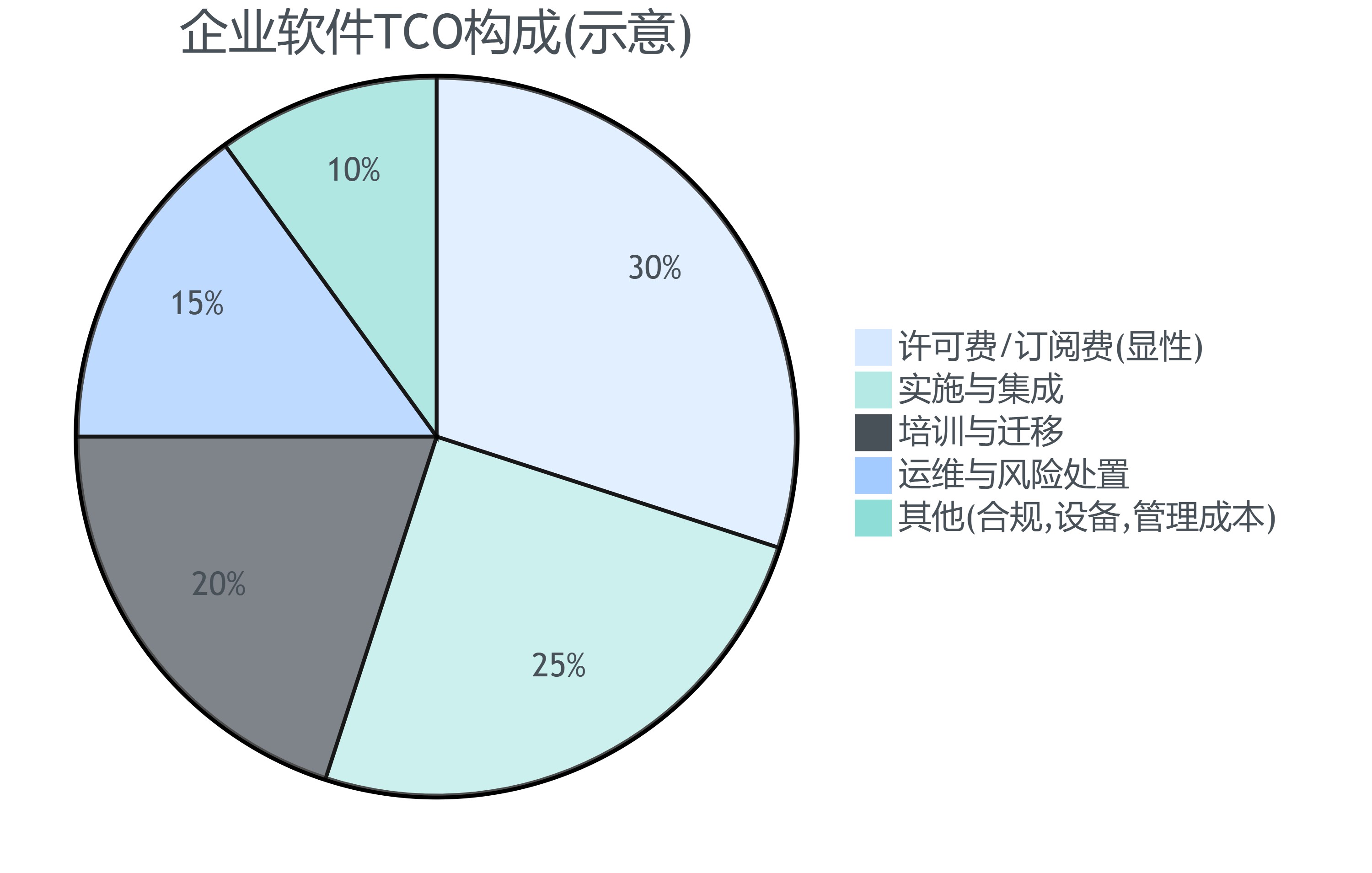 TCO = 显性采购费 + 实施集成费 + 培训迁移费 + 运维与风险处置费 − 效率提升收益