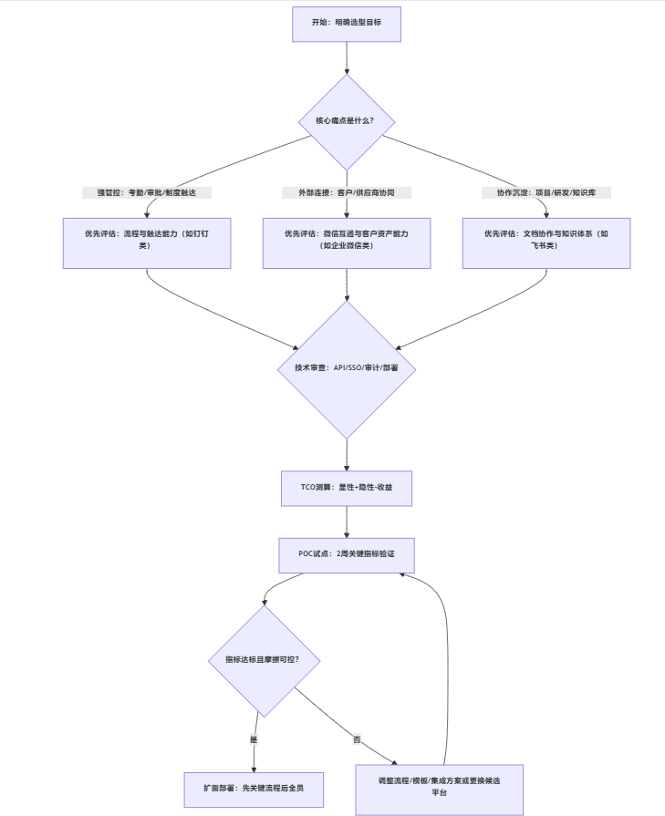 - 坚持2周POC再扩面:用日活、关键流程线上率、审批时长等硬指标做决策,指标不达标先改模板与流程。