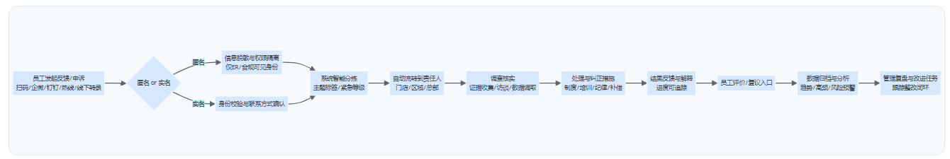 这里的边界条件是:并非所有事项都适合匿名。比如涉及人身安全、严重违规、职场暴力等,需要能够联系到当事人补充证据;但即便如此,也应允许员工先匿名提交,再由专岗在“保密承诺+权限隔离”下进行二次沟通,而不是一上来就要求实名并让门店管理者参与收集。