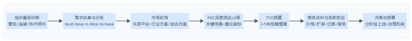 到这里,五个坑对应的本质问题就清晰了:成本曲线、合规底线、用户采纳、流程贯通与AI落地。下一部分我们把这些要求收敛成一套“可复制”的选型闭环。