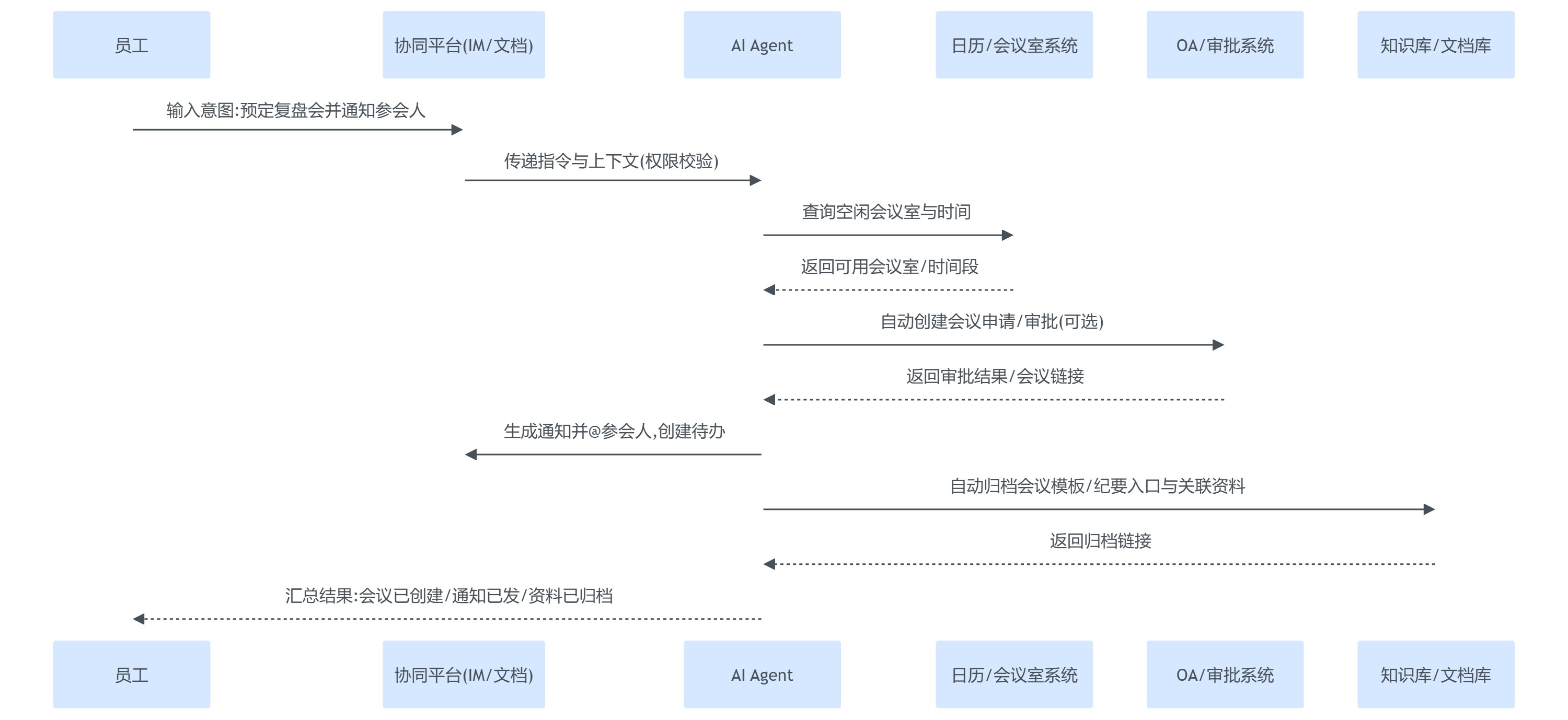 传统IM解决的是“我把信息发给谁”;意图化协同解决的是“我要完成什么”。例如一句“下周客户复盘会,帮我订会议室并通知参会人”,背后需要打通:日历、会议室、参会人组织架构、通知、会议纪要模板、任务分派。