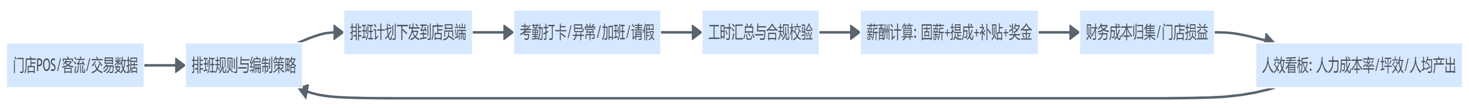 - 客流/销售波动 → 排班策略调整 → 考勤与工时变化 → 薪酬成本变化 → 坪效/毛利影响;