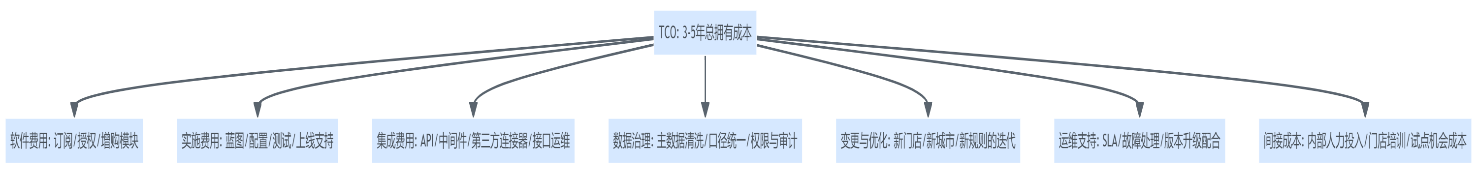 连锁零售在预算上最容易犯的错误,是把“订阅费/授权费”当成全部成本。但在真实项目里,TCO(总拥有成本)往往由多项组成:实施与培训、接口与集成、数据治理、二开配置、运维支持、账号与组织扩张带来的费用变化等。