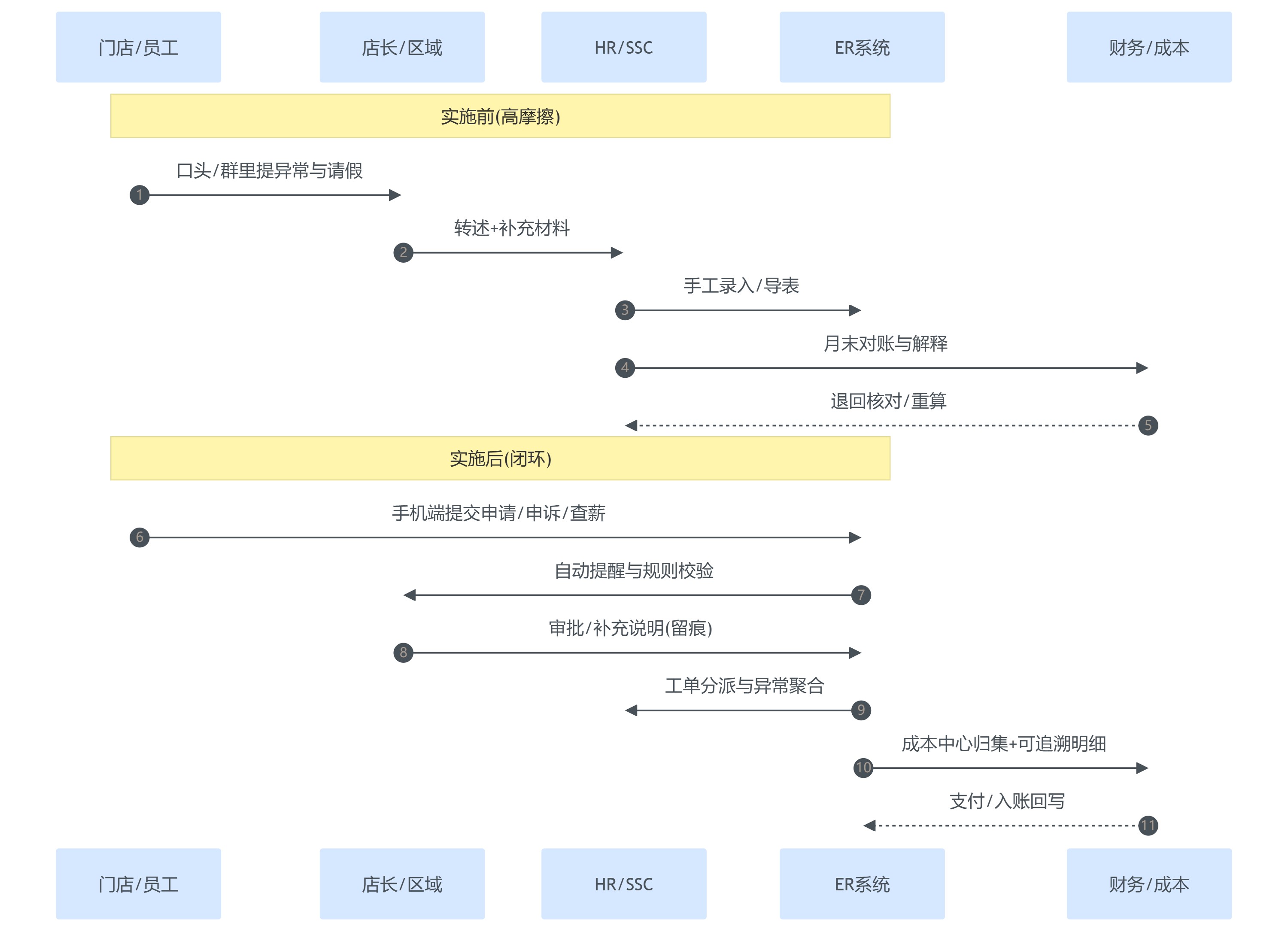 - 复杂薪酬链路:POS业绩归因 → 提成规则引擎计算 → 月中转岗/跨店支援拆分 → 审核与追溯 → 成本归集到门店/成本中心